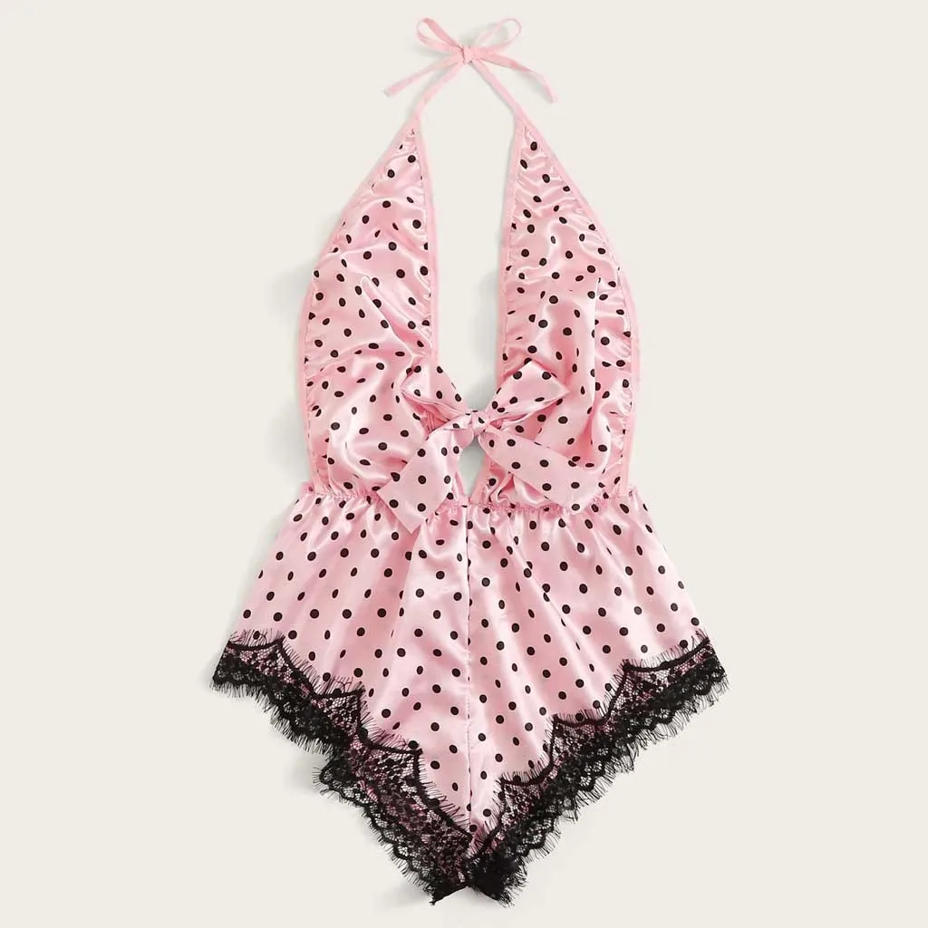 Женское сатиновое нижнее белье, сексуальное нижнее белье с принтом листьев и глубоким V-образным вырезом, кружевное, с бантом, с открытой спиной, пижамы, нижнее белье