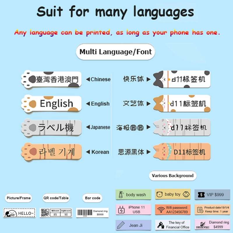 Карманный принтер для этикеток Niimbot D11, портативная Термопринтер для этикеток BT для домашнего и офисного использования с usb-кабелем
