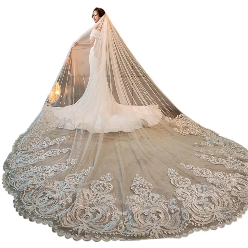 Романтическая длинная вуаль для свадьбы в соборе Кружевная аппликация 4 м свадебная фата с бесплатной расческой белый цвет слоновой кости высокое качество