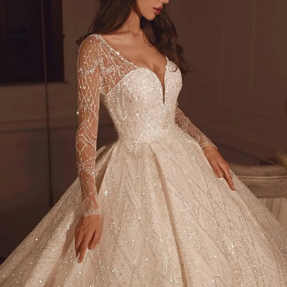 Роскошные свадебные платья, бальное платье, кристаллы, бисеры, блестки, v-образный вырез, прозрачные, длинные рукава, Дубай