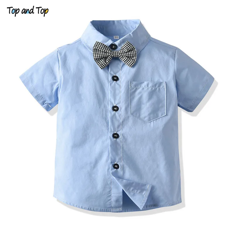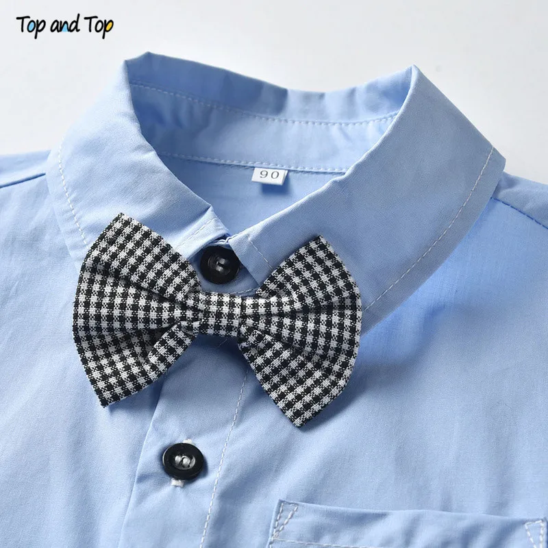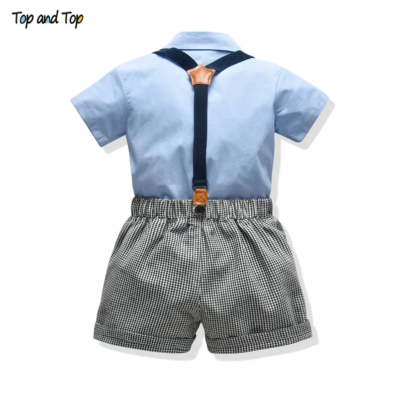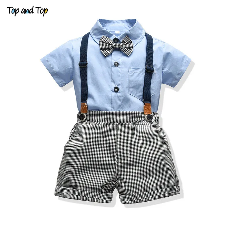 Летний комплект одежды для мальчиков, рубашка с коротким рукавом, галстук-бабочка + сарафан в клетку, шорты