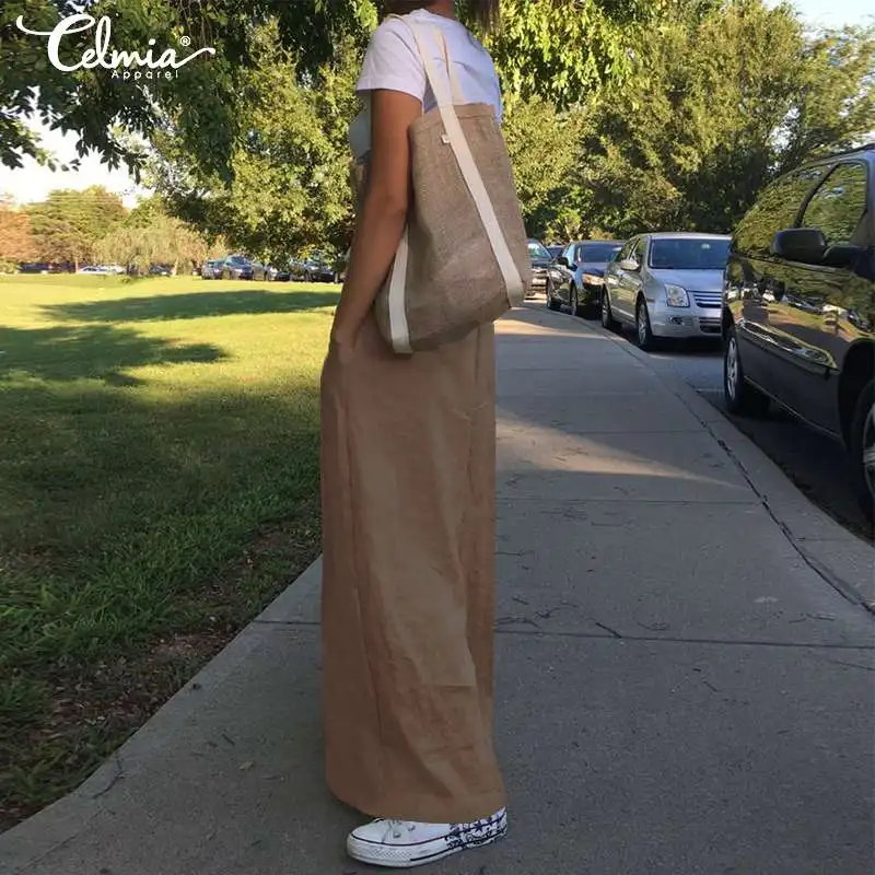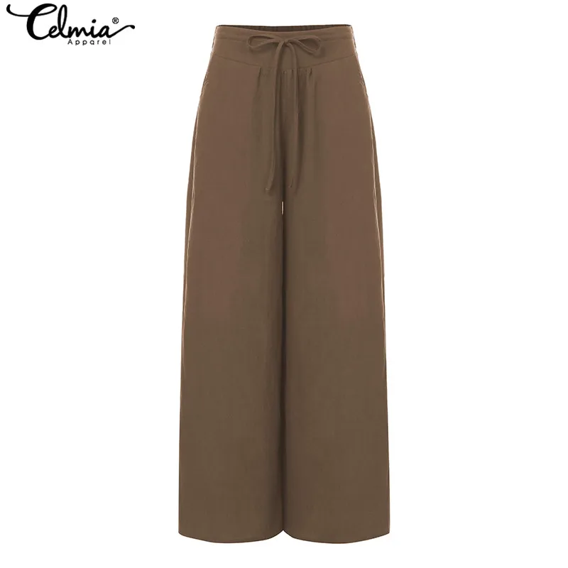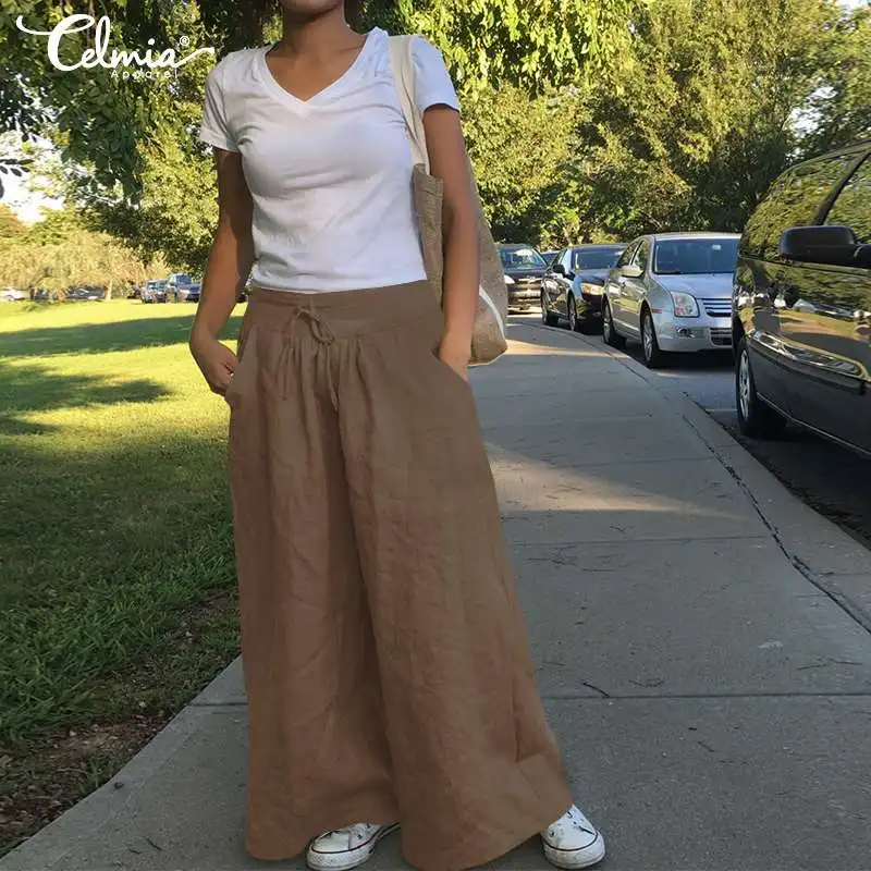 Брюки Celmia женские с широкими штанинами, Винтажные льняные однотонные повседневные свободные штаны с высокой талией, в стиле оверсайз, 2021