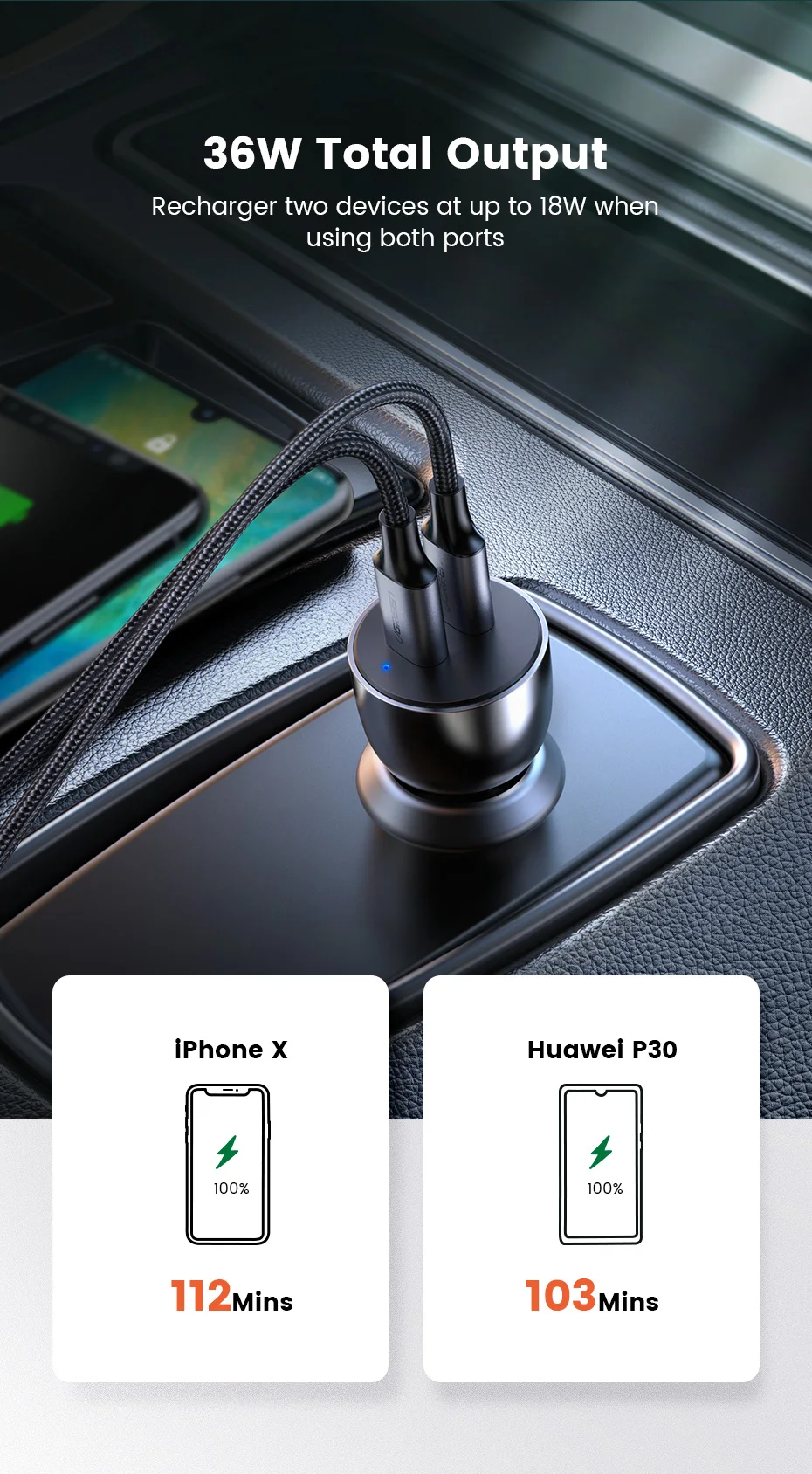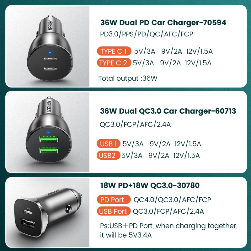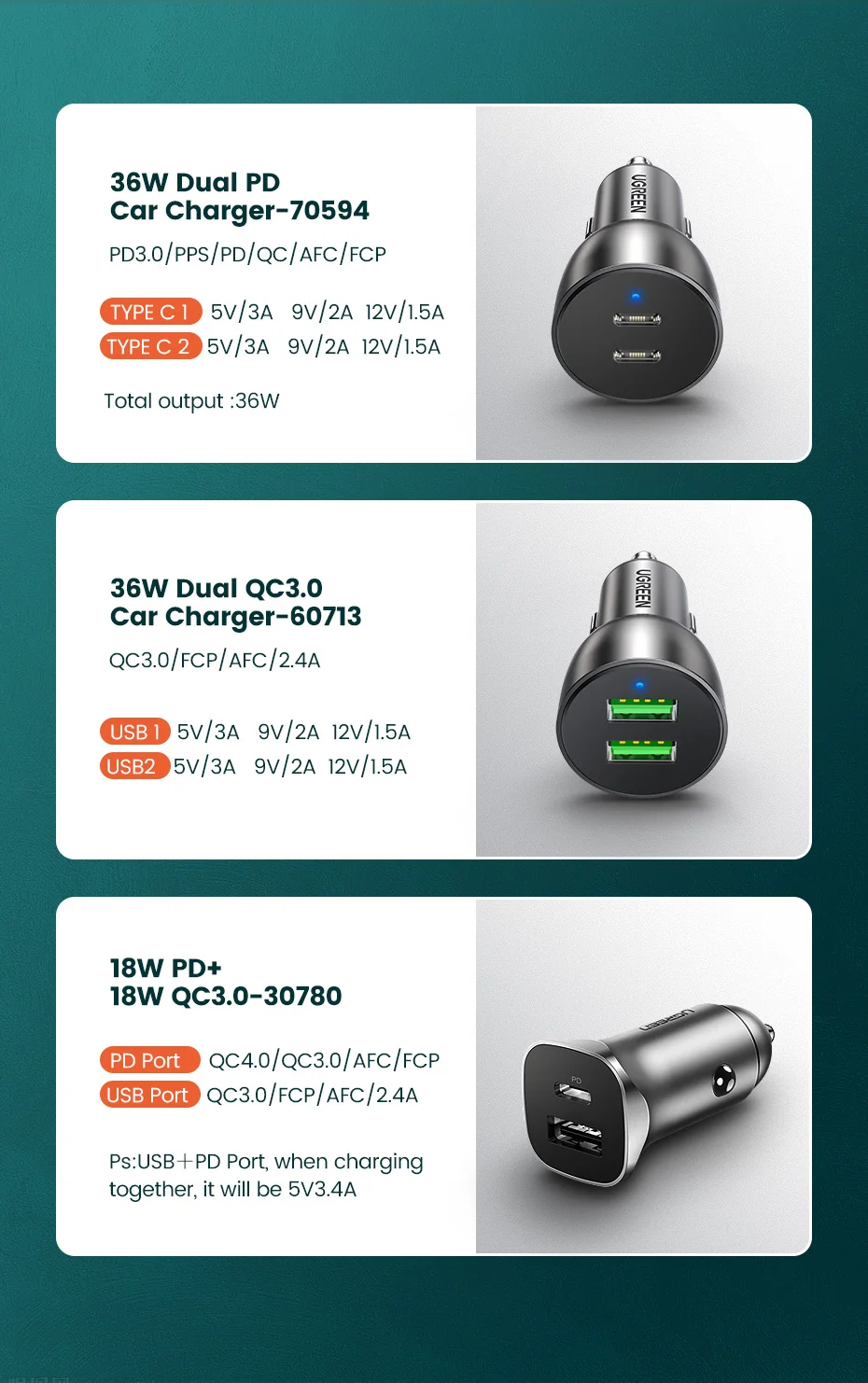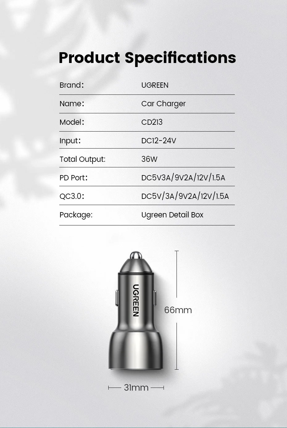 Автомобильная зарядка Ugreen 36 Вт PD, быстрая зарядка 4,0 3,0 Для Xiaomi QC4.0 QC3.0 Тип C PD, автомобильная зарядка для iPhone 13 12 Xs 8 PD, зарядное устройство