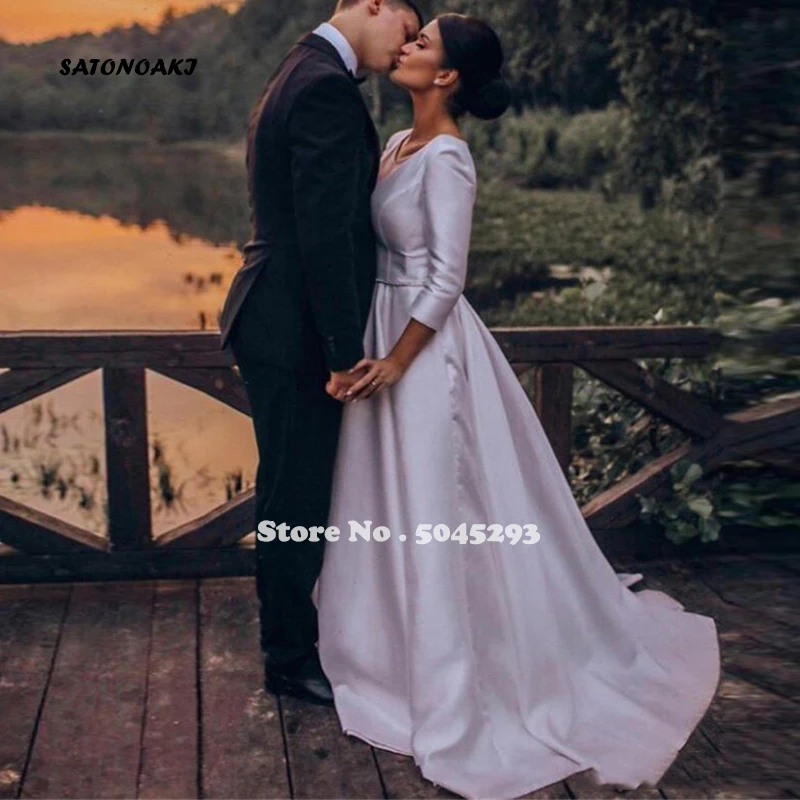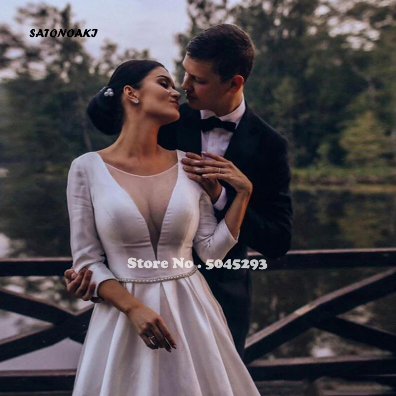 Элегантное атласное свадебное платье в стиле бохо 2022 для Женщин Прозрачное платье с глубоким круглым вырезом рукава 34 Иллюзия пуговицы сзади жемчужные бусины Свадебные платья