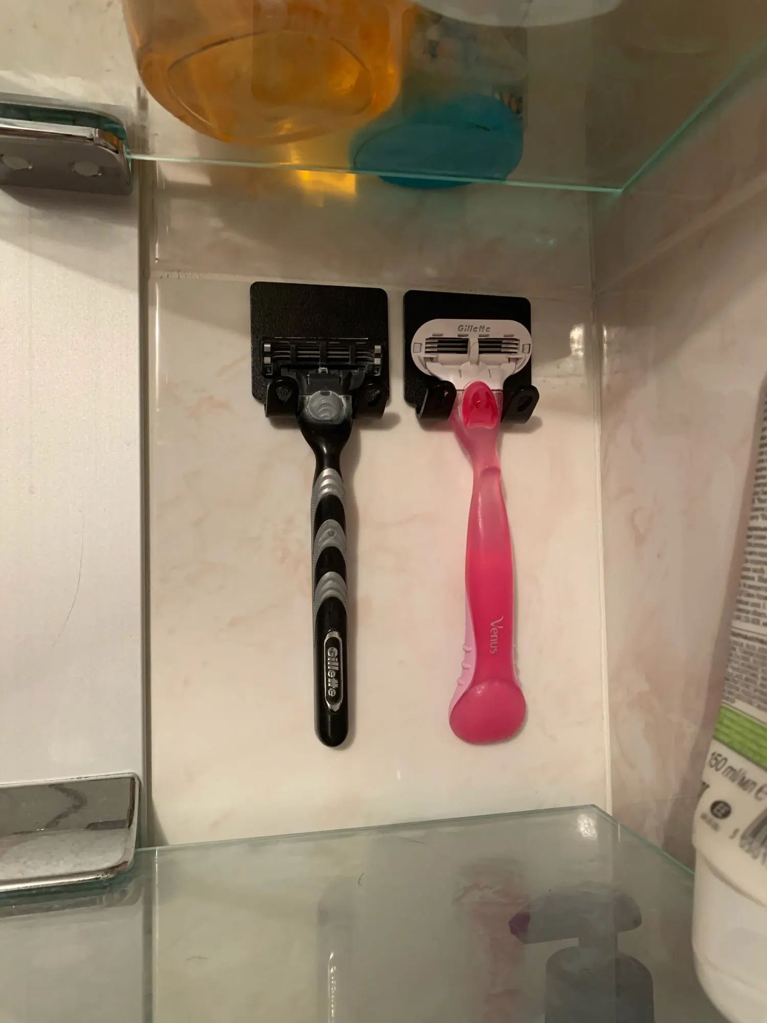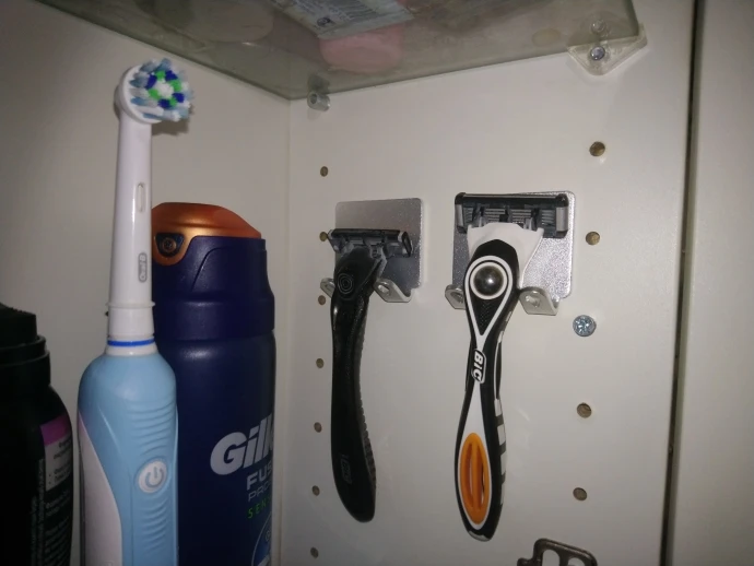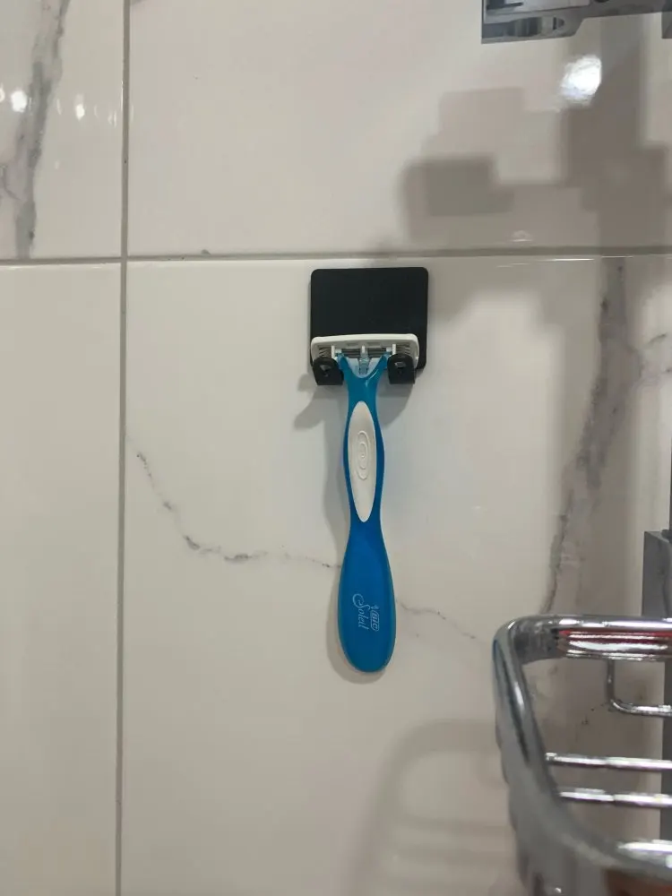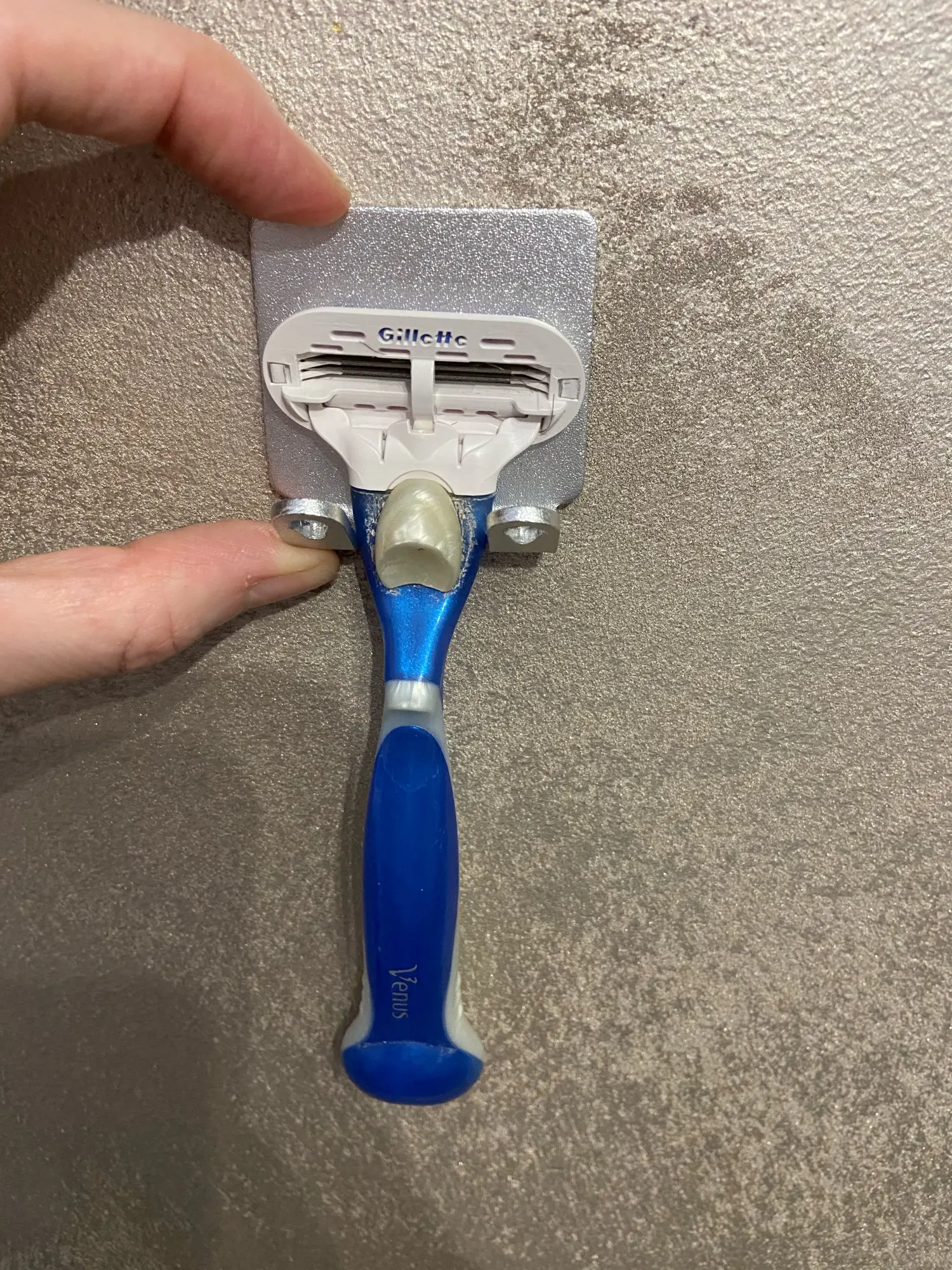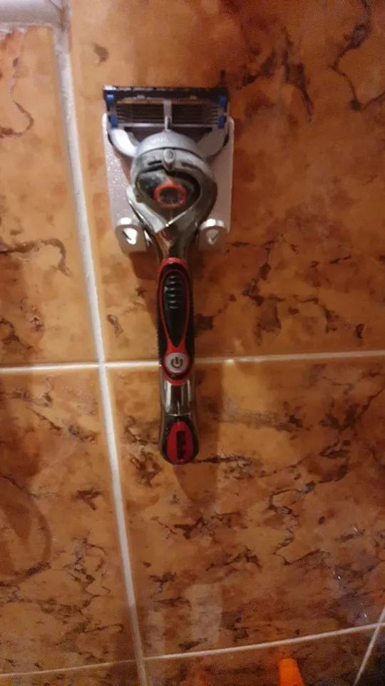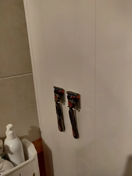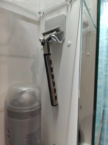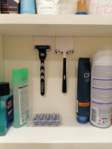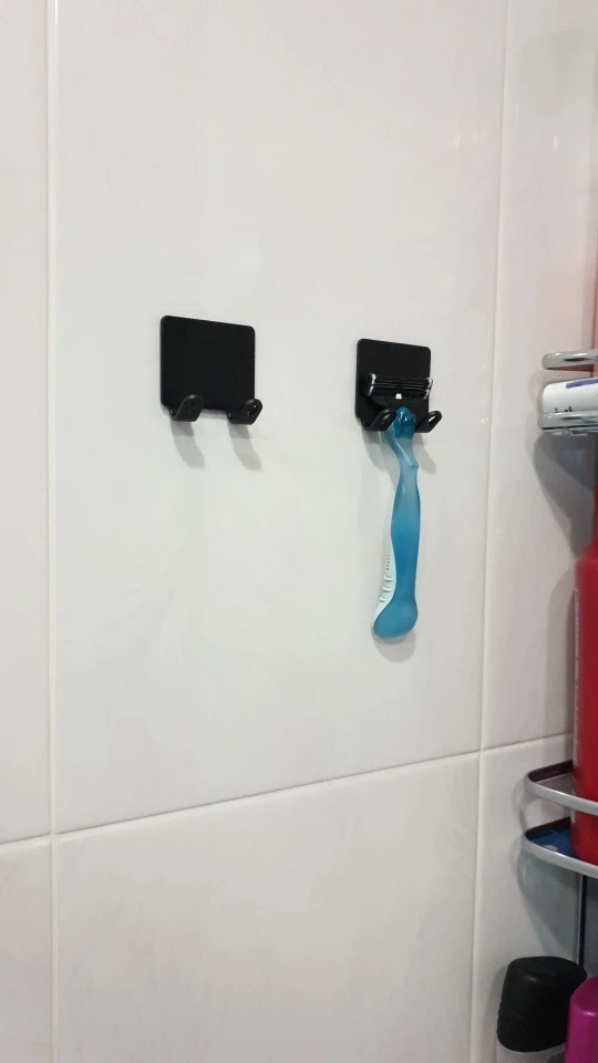 Честно не ожидала , что будут держать разные станки, но по фото видно, приклеила в душевой кабине. Я в восторге, держатся отлично и советую всем купить такие держатели. Они крепкие стальные . Склеру респект и процветания.