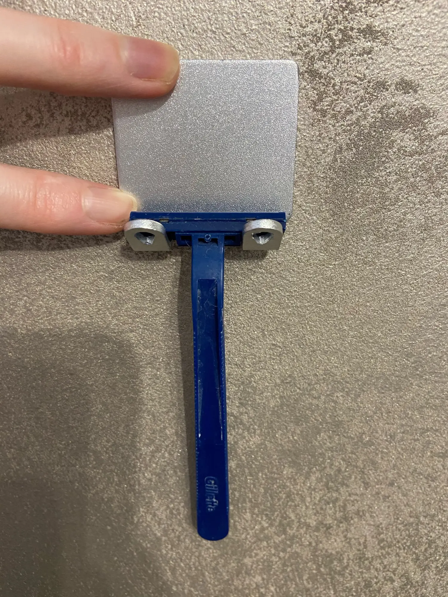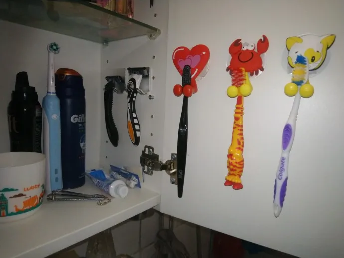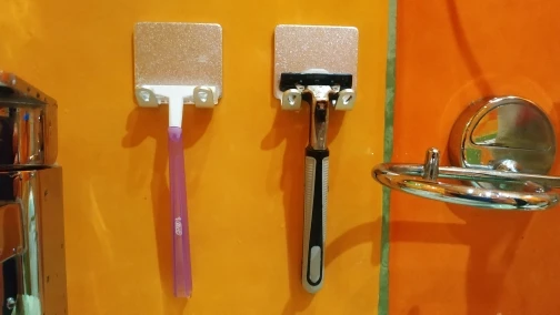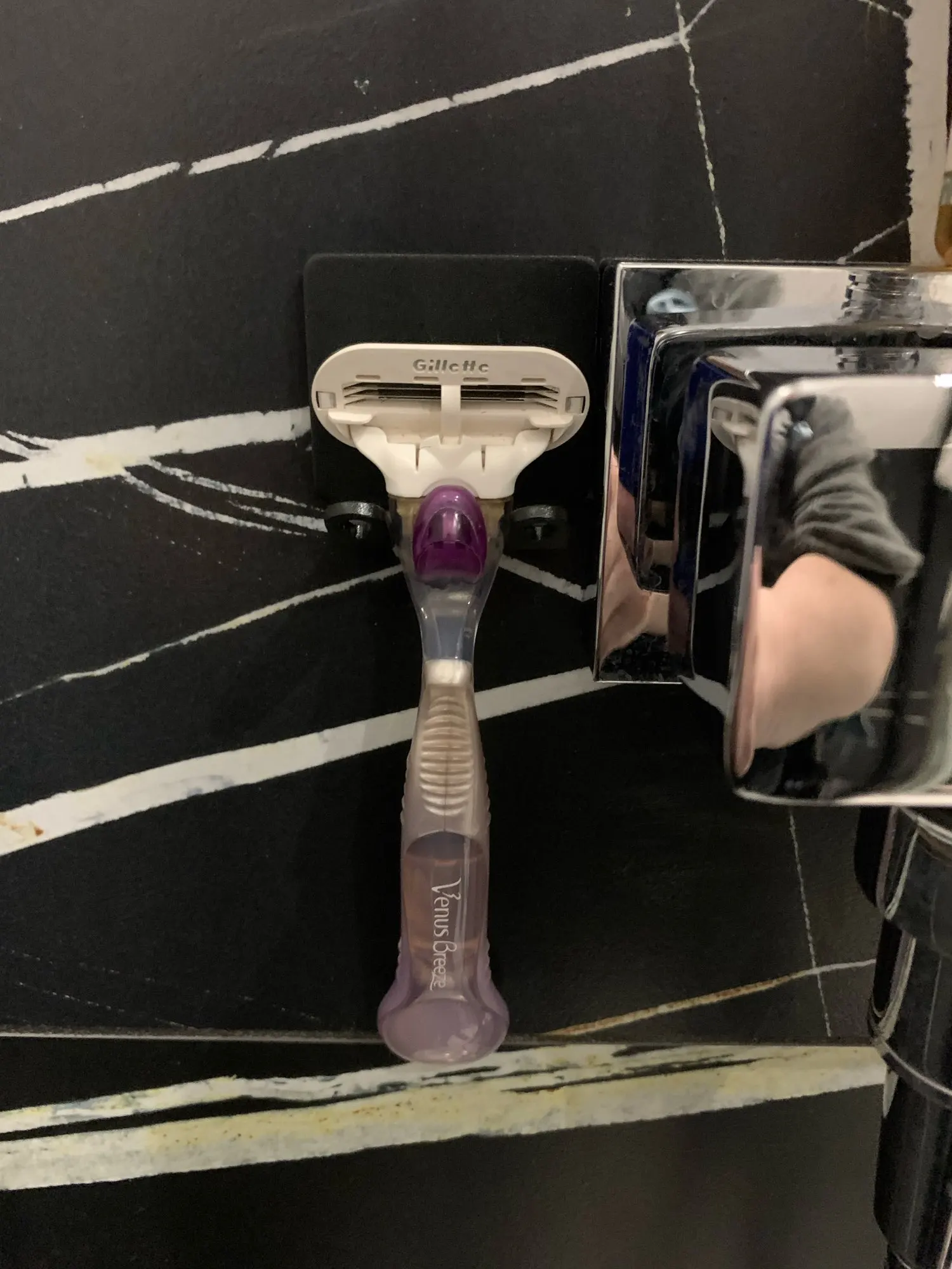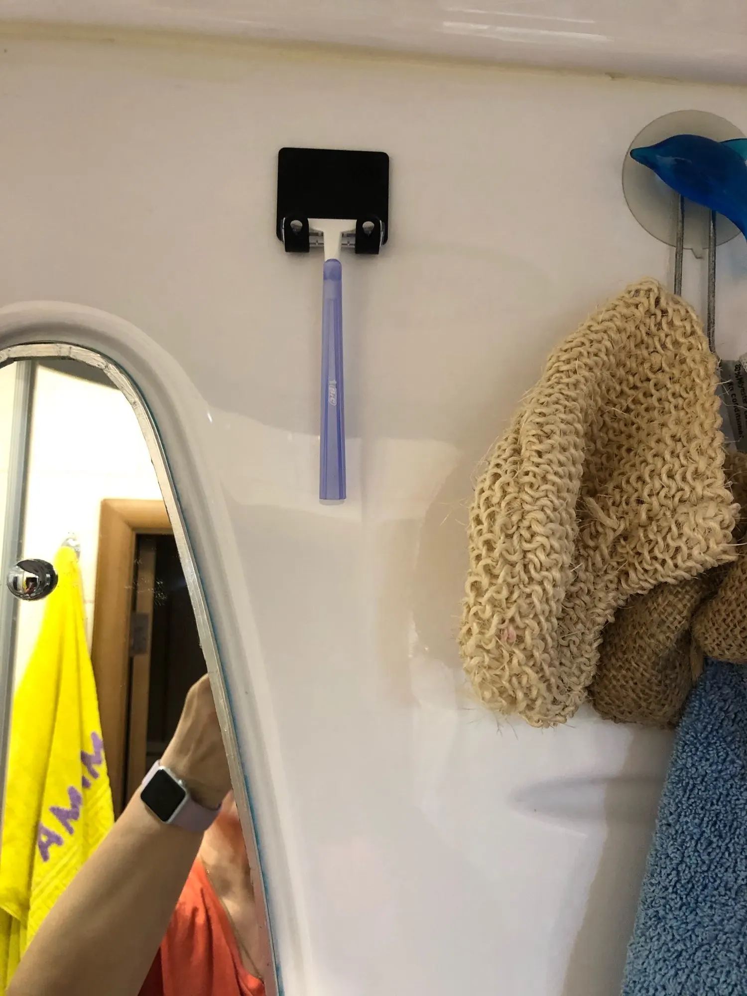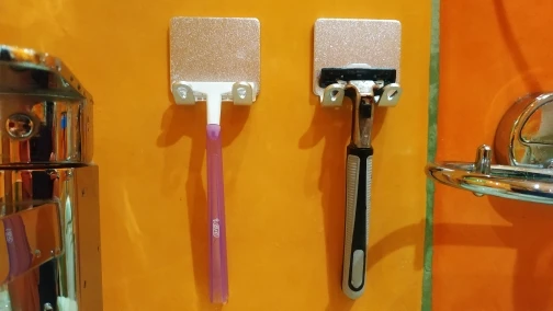 Честно не ожидала , что будут держать разные станки, но по фото видно, приклеила в душевой кабине. Я в восторге, держатся отлично и советую всем купить такие держатели. Они крепкие стальные . Склеру респект и процветания.