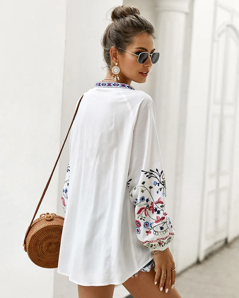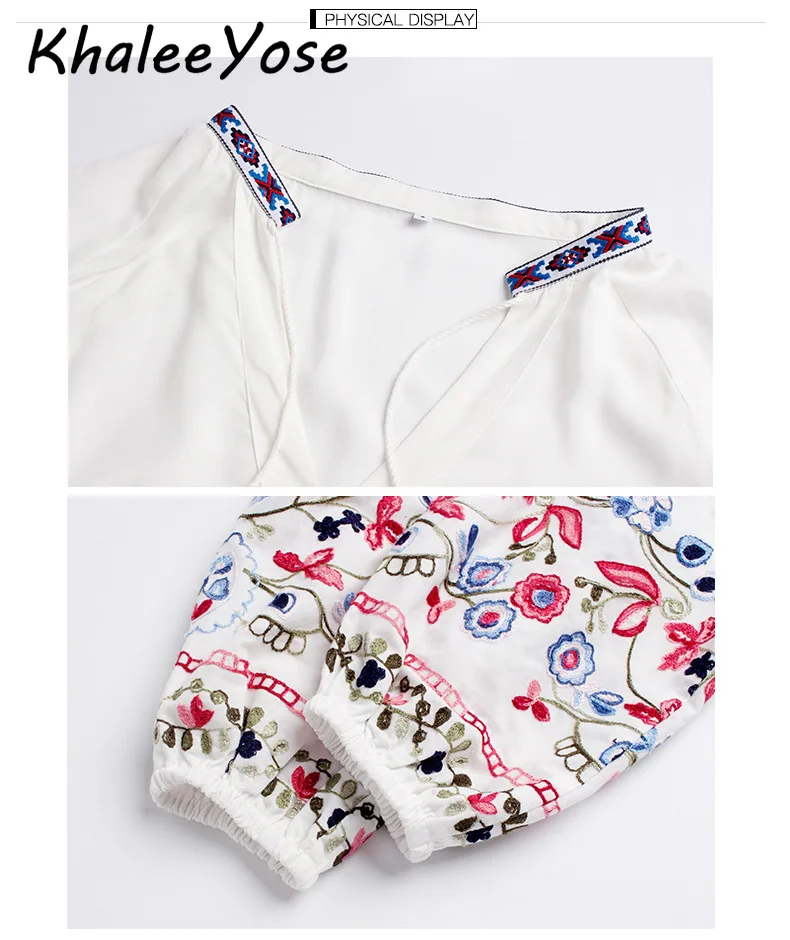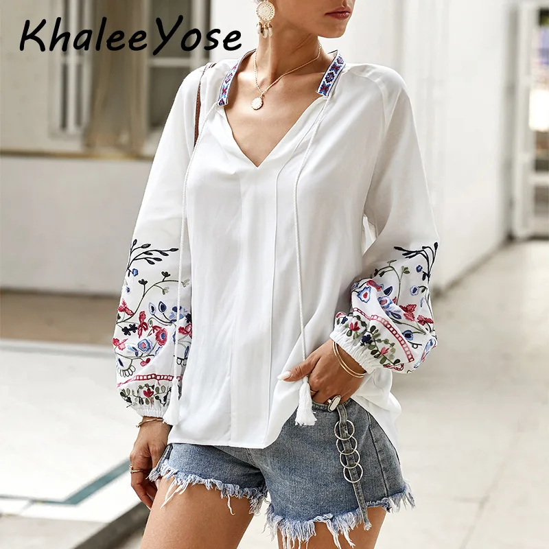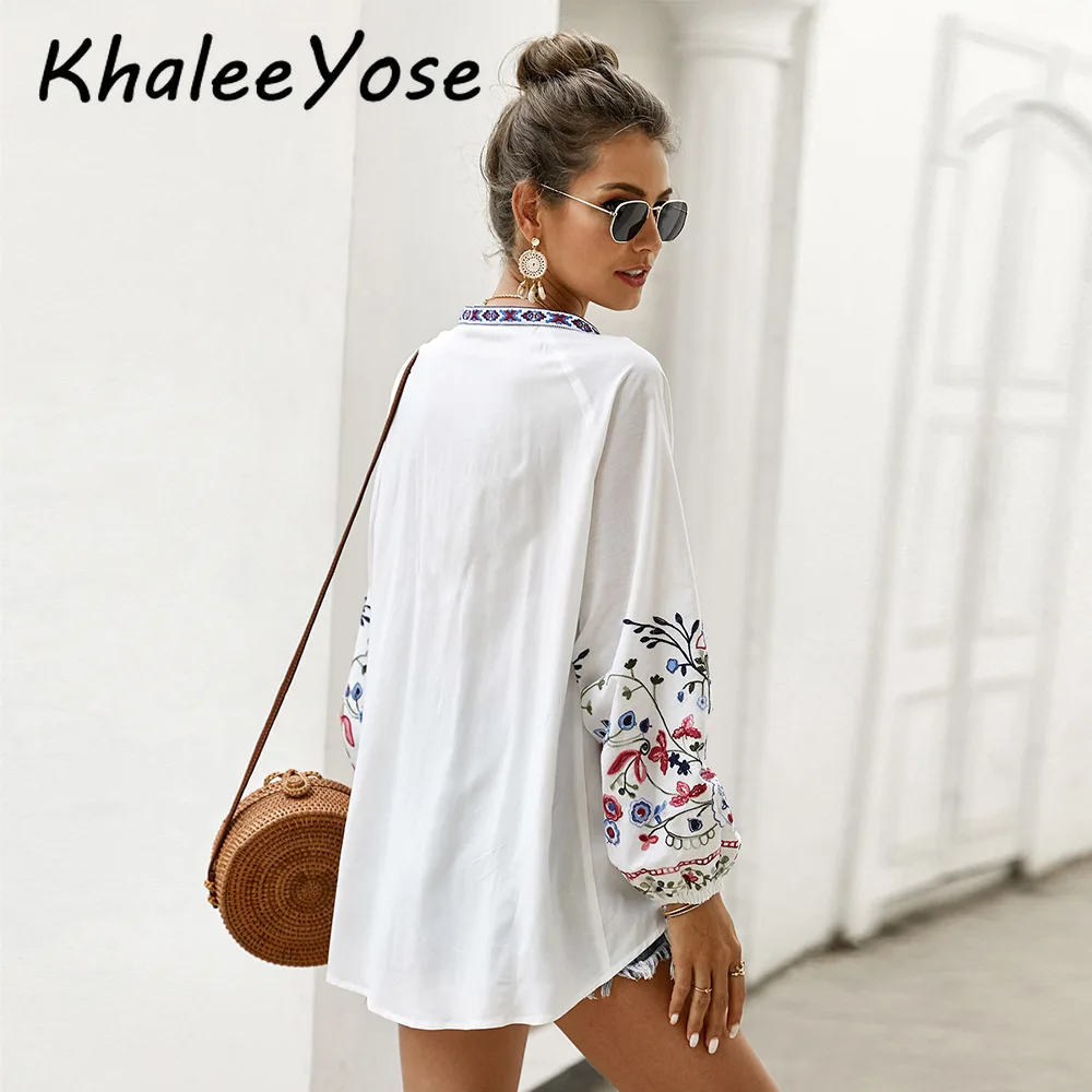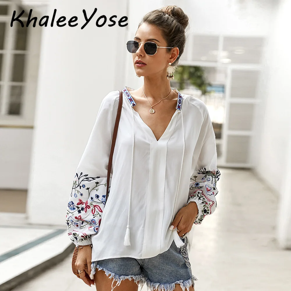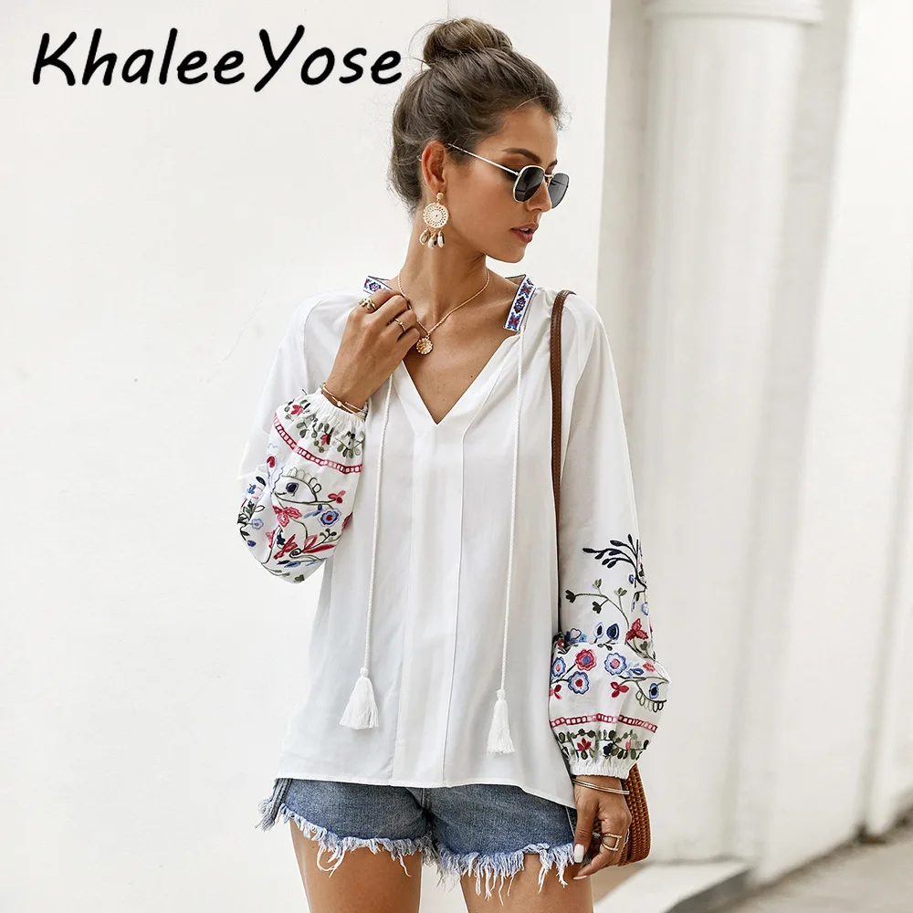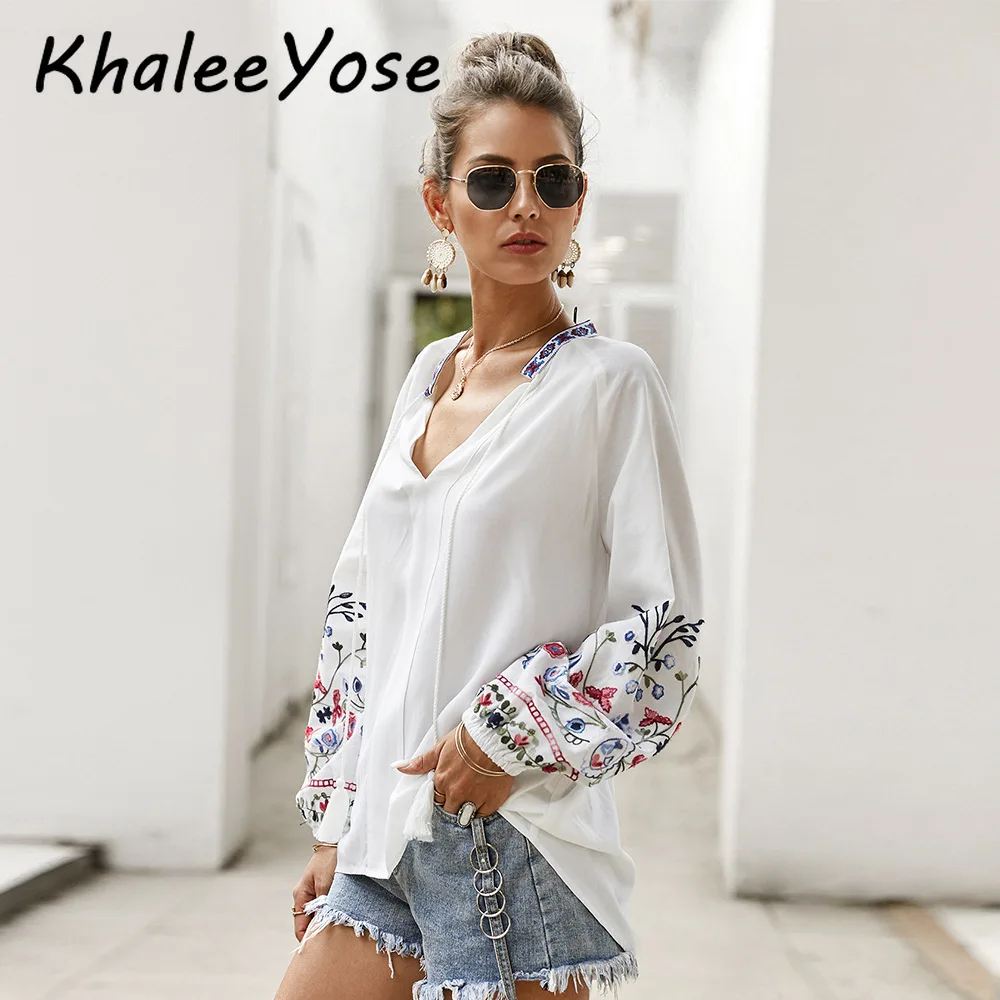 KHALEE YOSE блузки Бохо с цветочной вышивкой белые женские топы Свободная блузка рубашка с длинным рукавом хиппи топ в цыганском Стиле Весна 2020