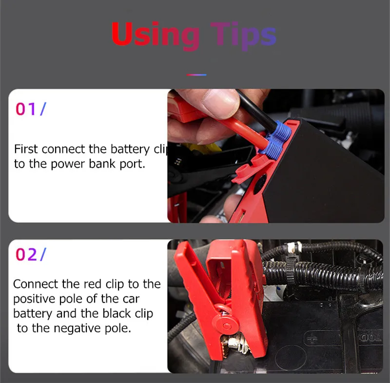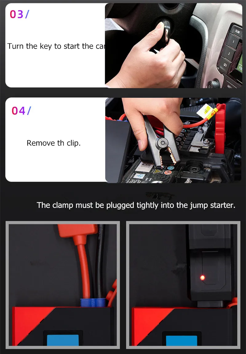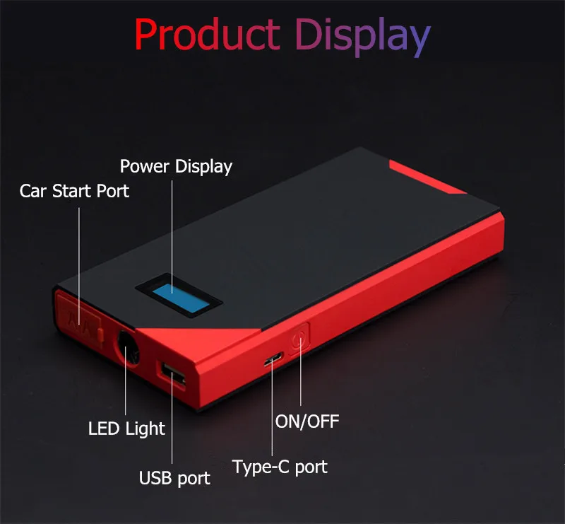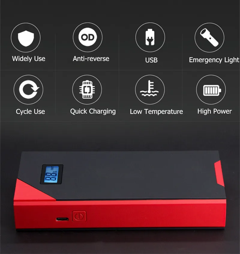 Особенности: 1. Зарядка для мобильных телефонов и ноутбуков, пусковые автомобили, регулируемые светодиодный ные фонари (фонарь, стробоскопы и сигналы SOS). 2. Различные зарядные устройства и поводок, которые могут дать вашему автомобилю и вашим продуктам дополнительную энергию, которая им нужна. 3. Реальная емкость аккумулятора 10000 мАч, запуск бензиновых автомобилей 6.0л или ниже, запуск для дизельных автомобилей 3.0л или ниже. 4. Обязательная и надежная необходимость в дальнем путешествии. 5. Защита от перезарядки; Защита от перегрузки по току; Защита от перенапряжения; Защита от перегрузки по току 6. Он поддерживает автомобили с напряжением 12 В, для запуска автомобиля, во-первых, вы должны подключить внешний аккумулятор к держателю батареи, а затем подключить отрицательные и положительные разъемы держателя к аккумулятору вашего автомобиля. Спецификация: Емкость аккумулятора: 10000 мАч Тип батареи: полимерная литиевая аккумуляторная батарея Температура использования: -30-65 градусов Выход USB: 5 В 2 а/9 в 2 А Входное напряжение: 5V2A/ 9V2A Режим светильник: светодиодный светильник SOS светильник s
