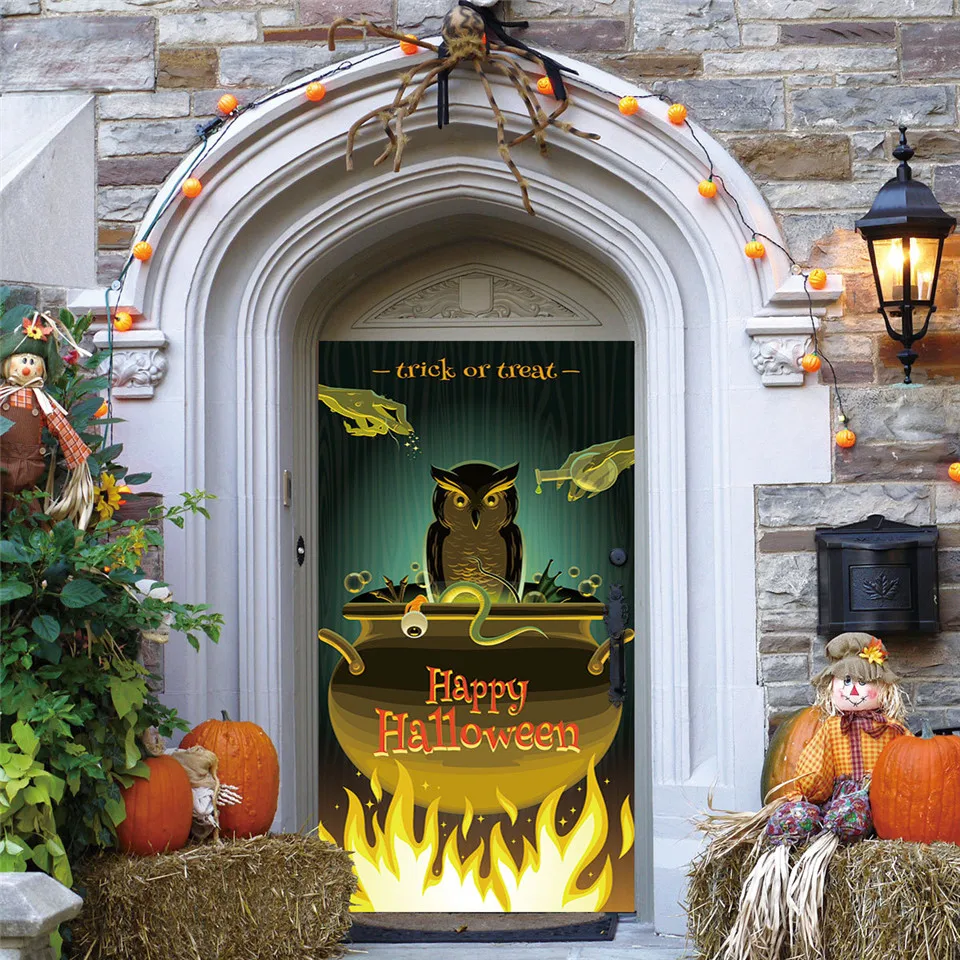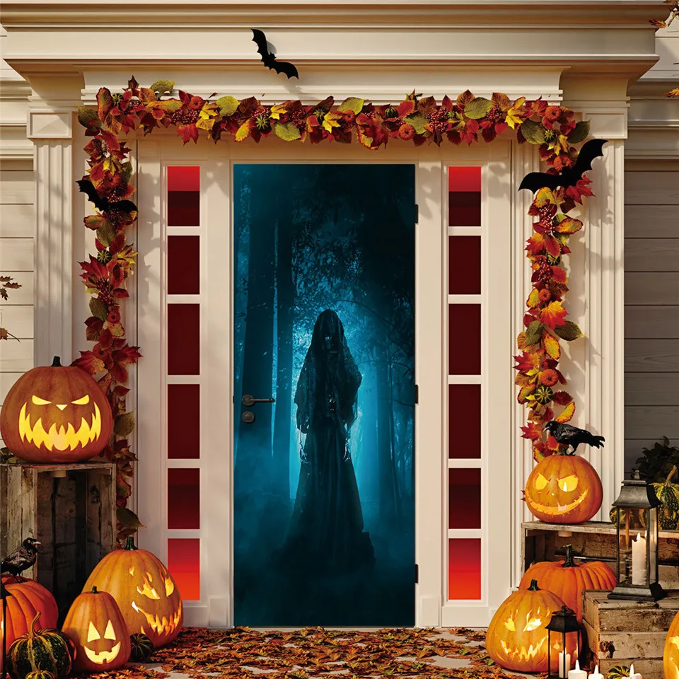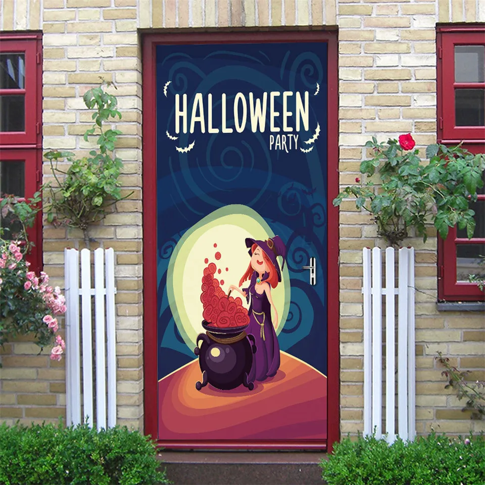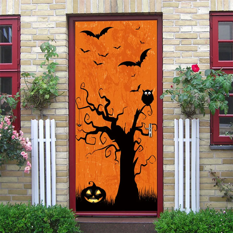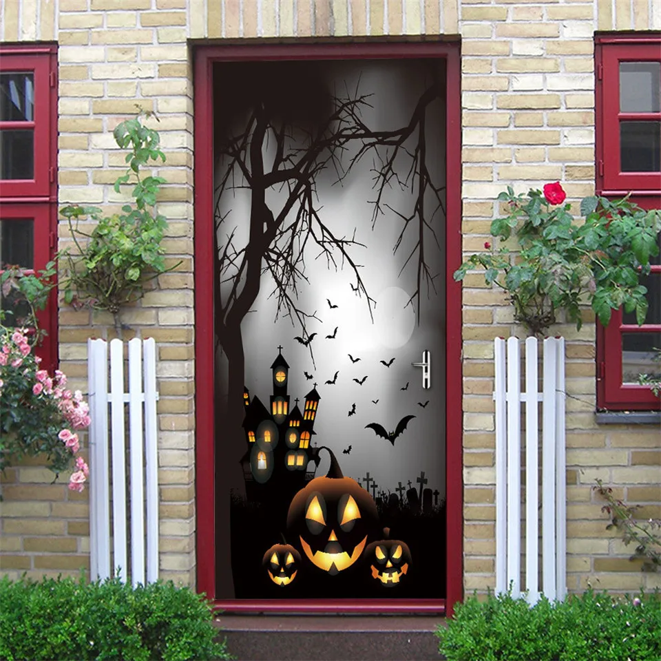 Декоративный постер на дверь с Тыквой и фонариком, настенные 3D наклейки на дверь в стиле Хэллоуин, летучая мышь, темный замок, съемные дверные наклейки, самоклеящиеся