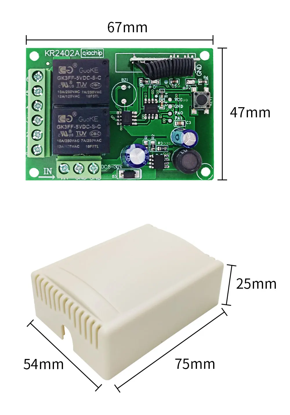 Характеристики передатчика:Номер модели: KT09-117S-4Рабочая частота RF: 433 МГц.Кодированная система: 1527 код обучения.Рабочее напряжение: 6 В постоянного тока.Рабочий ток: 12 мА.Мощность передачи: 10 мВт.Беспроводное рабочее расстояние: 50 м (свободное пространство).Скорость передачи: 50 ~ 60 кГц.Отклонение частоты: 0,2 МГц или 0,2 МГц.Цвет: черный.Посылка Размеры: 6,5*3,2*1,5 см/2,55*1,25 * 0.59in.Вес посылка: 30 г/1,05 унций.Характеристики приемника:Модель: KR2402A-4Вид продукции: 2-КАНАЛЬНЫЙ пульт дистанционного Управление переключательРежим работы RF: ASK superгетеродинный приемРежим модуляции: ASKРежим работы: Мгновенный/тумблер/защелкивающийся и т. Д.Режим соответствия: Интеллектуальный код обучения.Мощность: Широкое напряжение DC 5V-30VТок покоя: 5 мАЧастота RF: 433 МГцРазмер печатной платы: 25*54*75 ммПримечание:Посылка включает в себя различные продукты, потому что вы выбираете различные варианты.