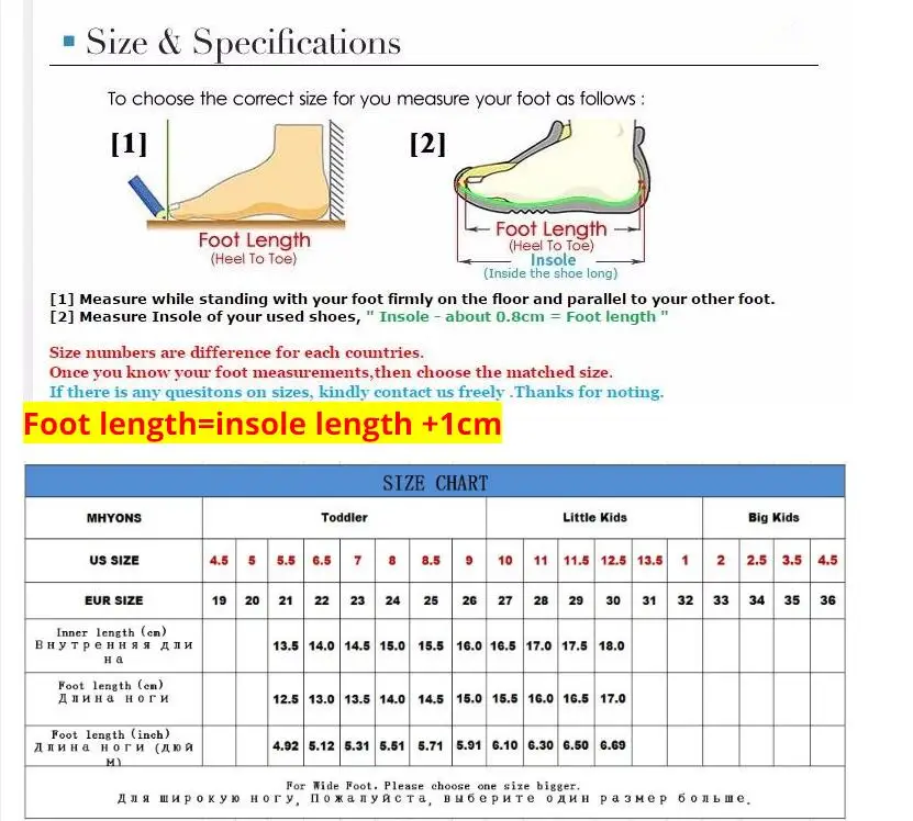 8. Очень важно: размер детской обуви не является стандартным, обязательно не выбирайте номер размера, единственный способ заставить вашего ребенка носить подходящую обувь-это измерить длину стопы вашего ребенка. Длина стопы-единственный стандарт!