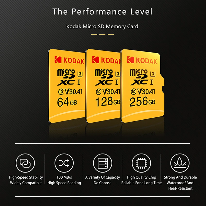 Карта памяти Kodak подходит для смартфонов, профессиональных камер, hd-камер, планшетных компьютеров, совместимых устройств с TF-картой, таких как видеорегистратор, GPS, оборудование для мониторинга, БПЛА и ТВ-стерео.