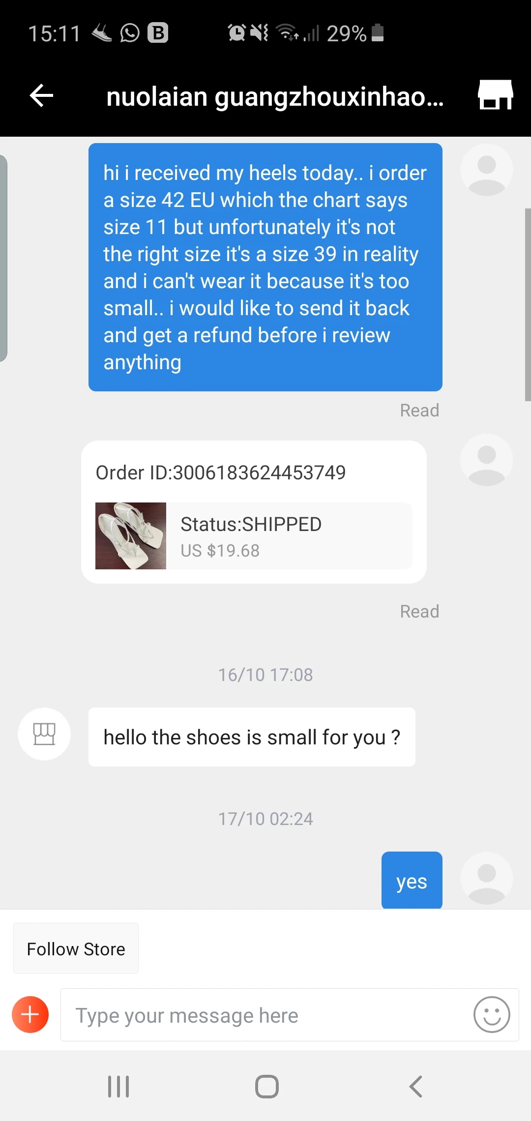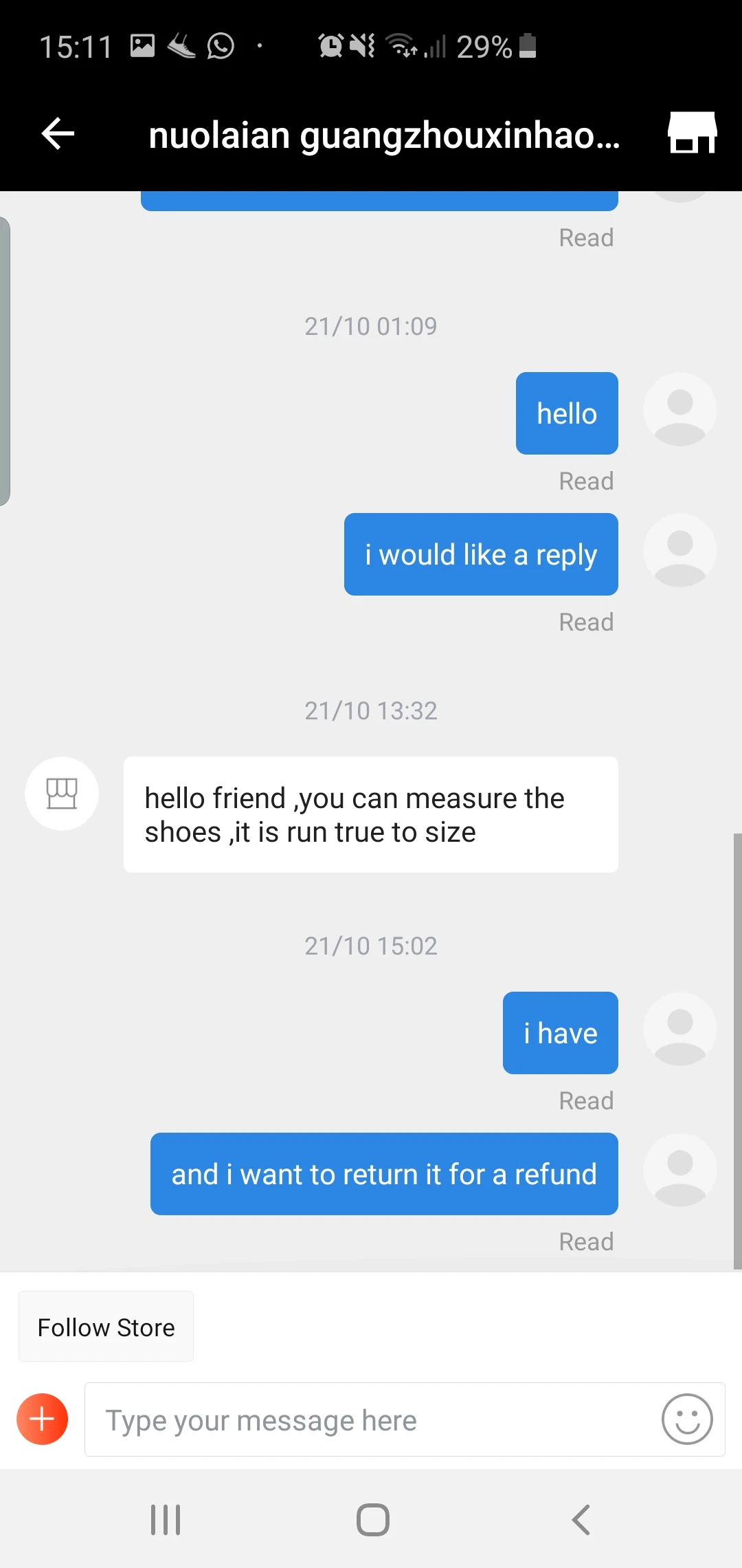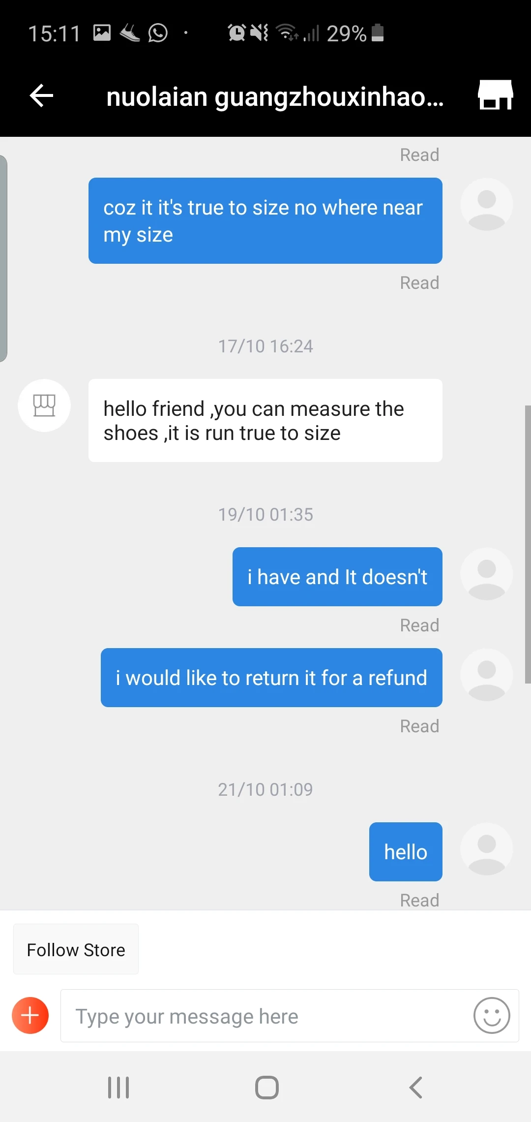 Обувь не соответствует размеру... я попросить вернуть обувь для возврата денег, и я был игнорирован .. Действительно плохое обслуживание клиентов и общение, даже самое худшее, я приложил фотографии чата ниже amd, все еще ничего не сделано по этому поводу. Я буду рекомендовать вам магазин где-то еще, и если бы я мог жить 0 звезд