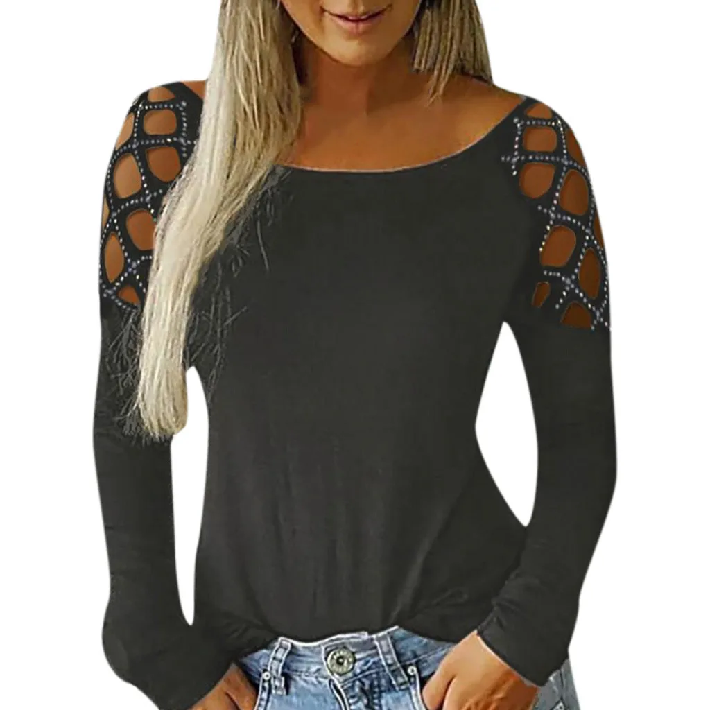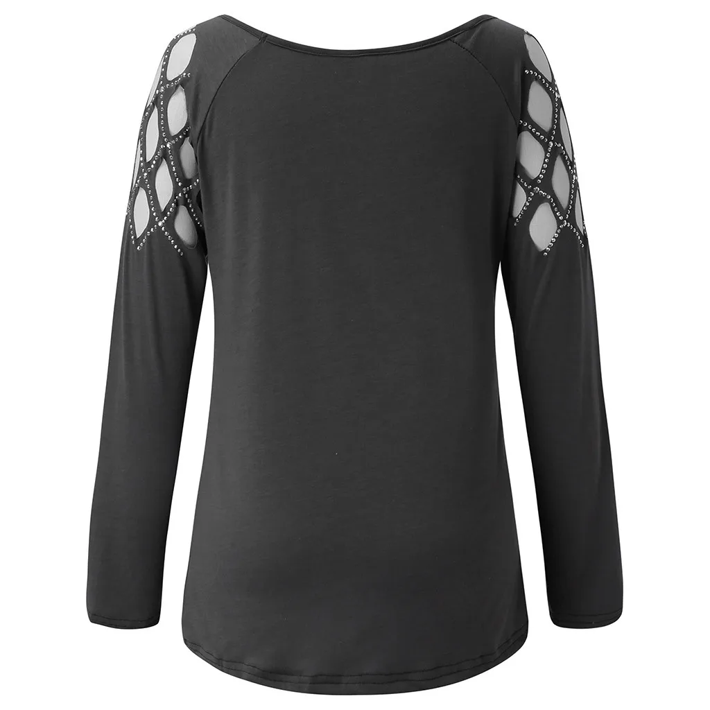 Женские модные футболки с вырезом лодочкой, украшенное стразами, с длинными рукавами, повседневные топы
