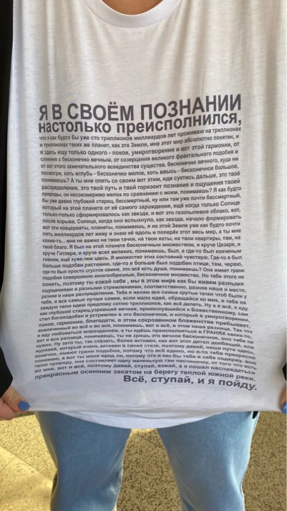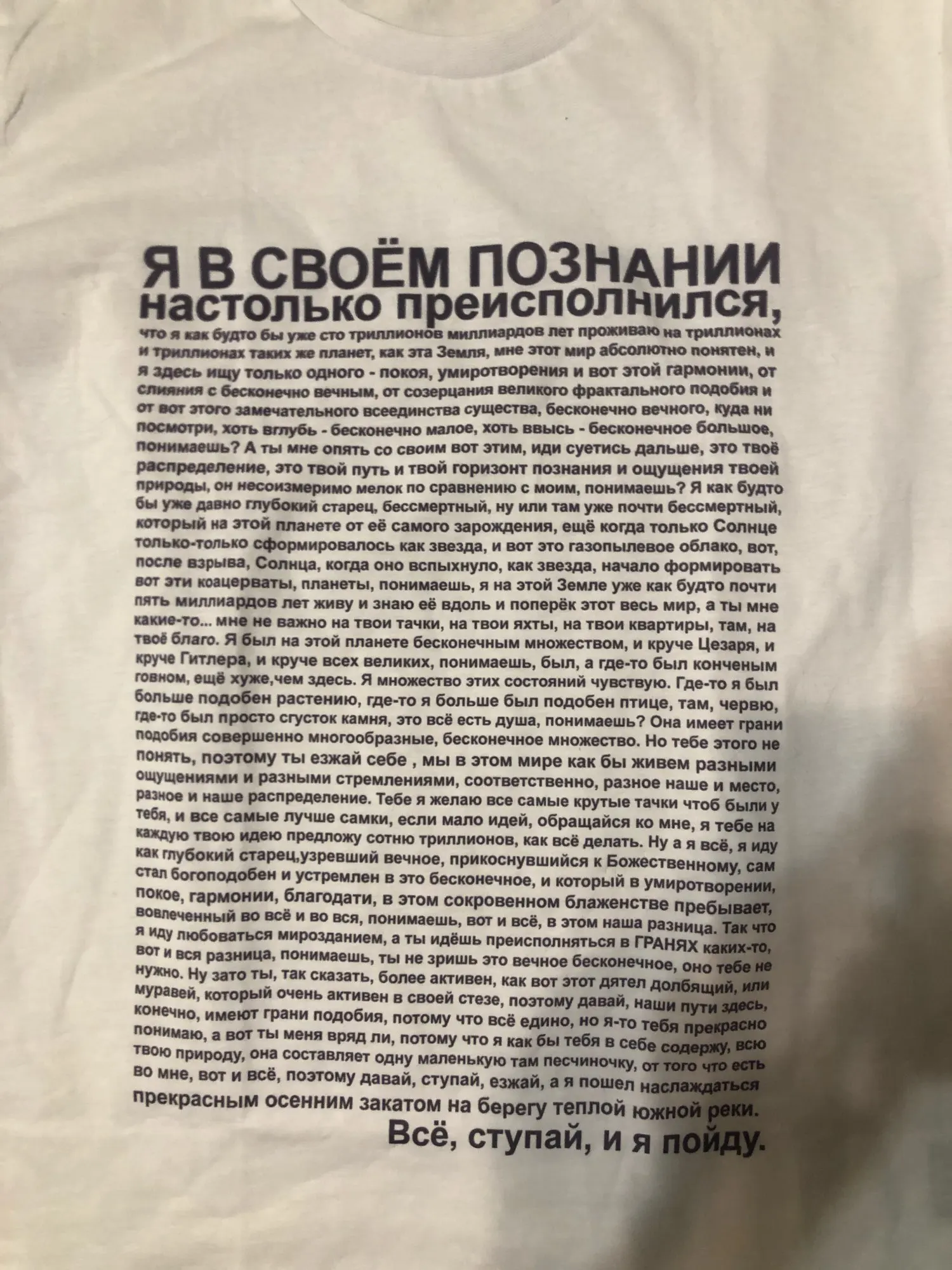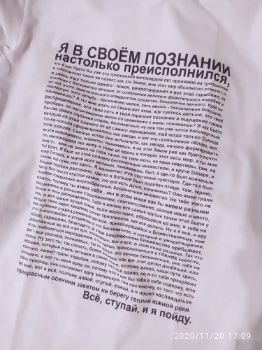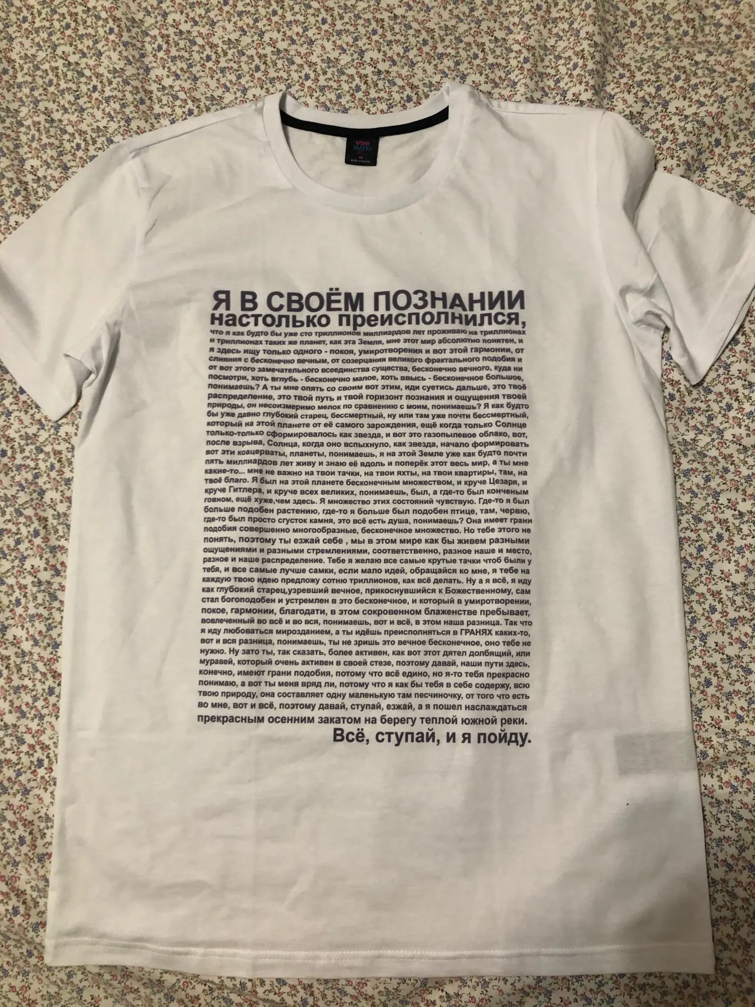 Футболка пришла быстро (за полторы недели), без каких-либо повреждений, недоработок и прочего. Качество текста на высоте, весь "монолог" Идущего к реке полностью читаем)) Кстати говоря, текст совпадает слово в слово, я проверил, так что, если кому-то это важно, можете не волноваться.