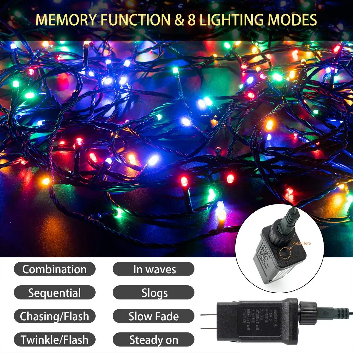 Восемь видов режимов:1. Постоянный светильник2. Волновой узор (мерцающий светильник от медленной скорости до быстрой скорости)3. Непрерывное изменение4. Изменение вспышки (от медленной вспышки до быстрой вспышки)5. Медленная вспышка6. Изменение мерцания7. Изменение яркости (от яркий светильник до мерцающий светильник)8. Быстрая вспышка Водонепроницаемость IP44Высокая степень водонепроницаемости позволяет выдерживать сильный дождь и снег, идеально подходит для украшения дома и улицы. 100% Сертификация UL100% UL сертифицирован для всего набора, включая светодиодные бусины, медный сердечник изолированный провод и 24V вилка низкого напряжения. Безопаснее в использовании. Модернизированная конструкция лампыКаждая лампа индивидуальная, если одна лампочка выгорит, остальные лампы останутся включенными. Технические характеристикиСветильник Цвет: теплый белый/RGB/синийПрименение: внутри/снаружиСветодиодный Количество: 100/200/300/400/800 светодиодныйДлина шнура: 10 м/20 м/30 м/50 м/100 мРежим работы: 8 режимов освещенияВходное напряжение: 110-240 ВВыходное напряжение: 24 ВВодонепроницаемость: IP44Вилка: ЕС/США/Австралия/Великобритания