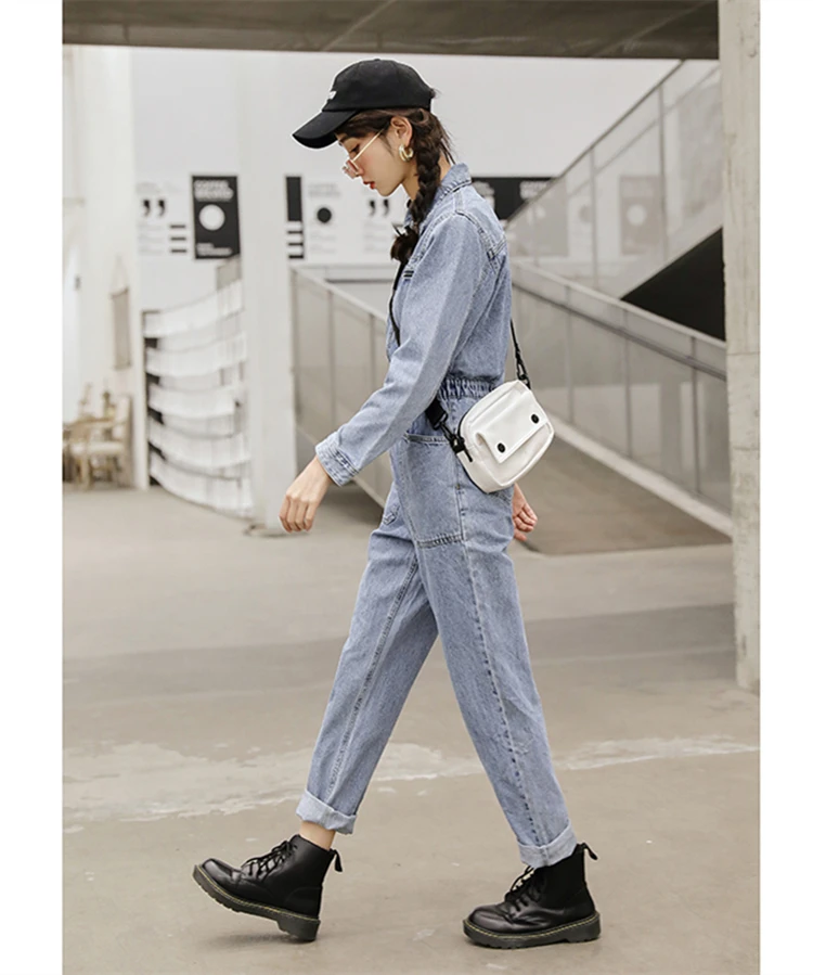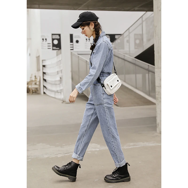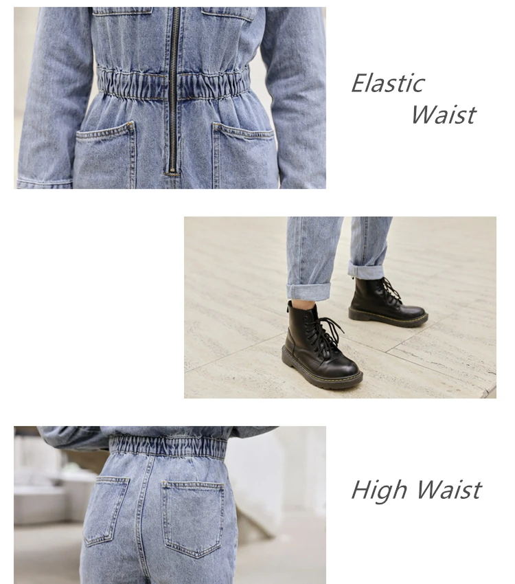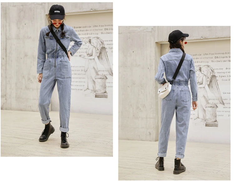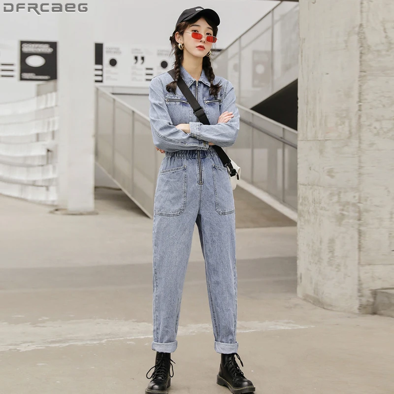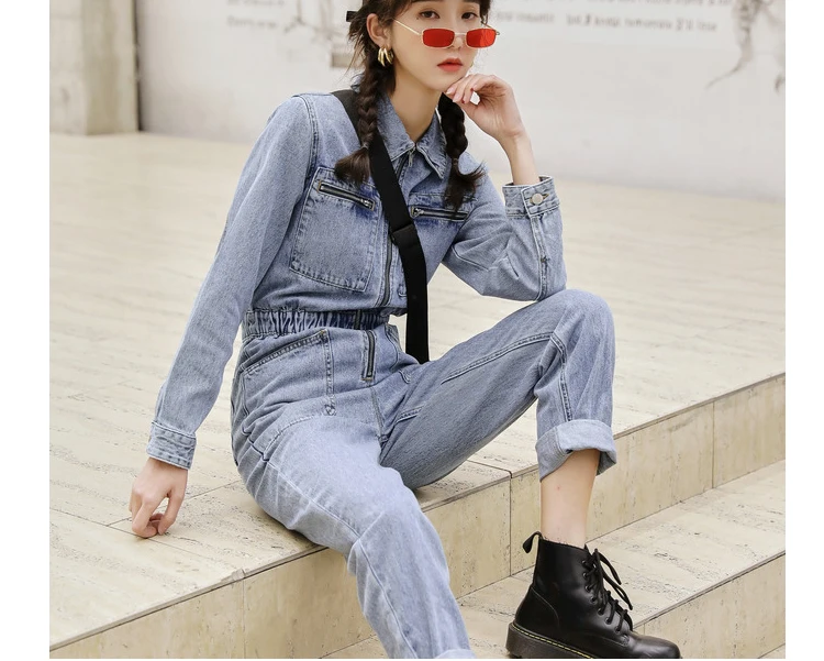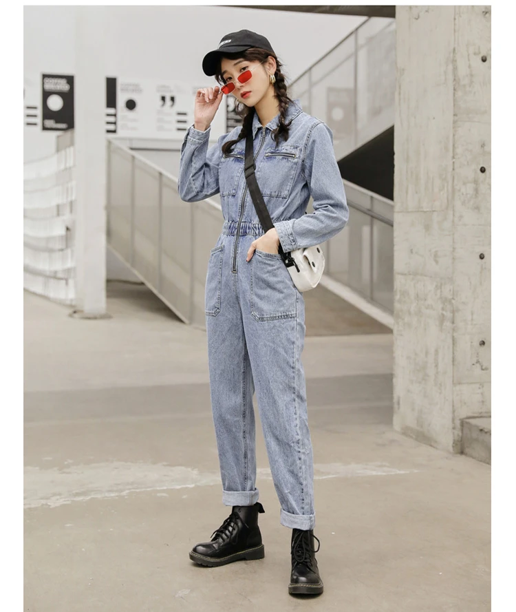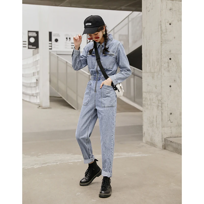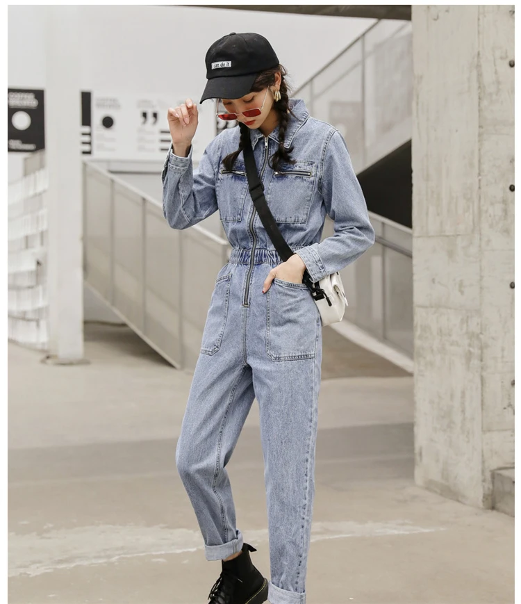 Комбинезон женский джинсовый с длинным рукавом, модная уличная одежда с эластичной завышенной талией, облегающий Ромпер на молнии, джинсовый комбинезон с большими карманами