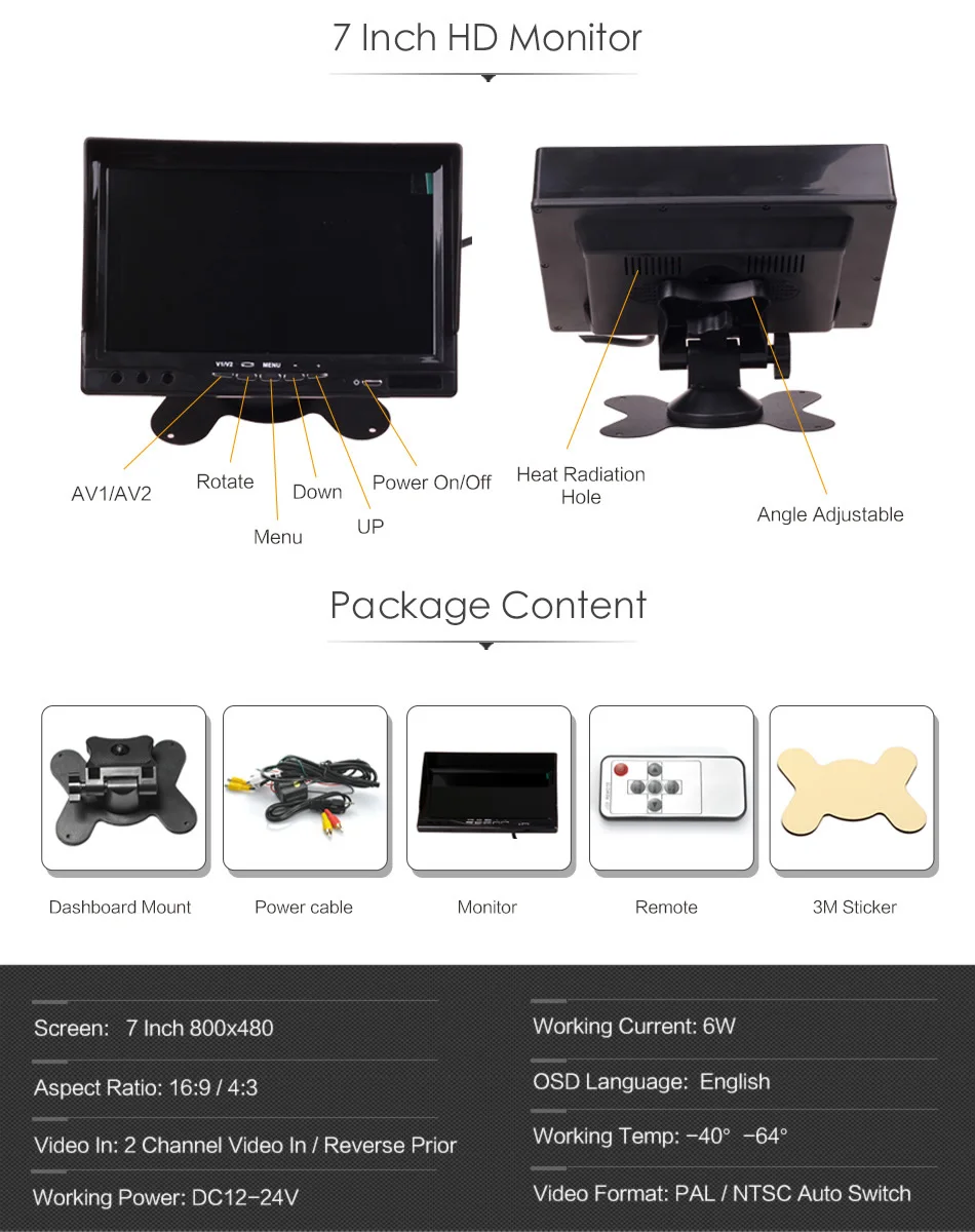 7-дюймовый широкоформатный ЖК-монитор с солнцезащитным козырьком Рабочая мощность 12В-24В Монитор с высоким разрешением 800x480 Может быть установлен в любой подголовник Поставляется с регулируемым кронштейном Отлично подходит для фильмов или в качестве монитора камеры заднего вида Четкие и яркие изображения с большой точностью цвета Подключается к любому DVD-плееру с выходом RCA Быстро и легко установить в любой автомобиль Доступная прямая от фабрики оптовая цена делает его отличным для рынка перепродажи
