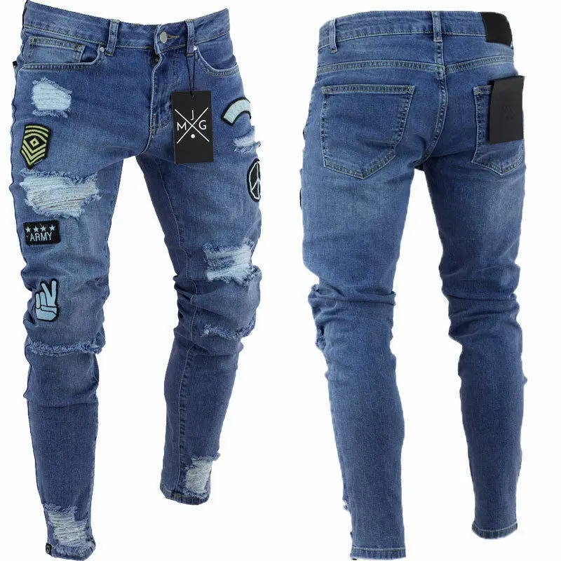Новые модные мужские облегающие джинсы, зауженные тянущиеся джинсы, потертые байкерские длинные джинсы с вырезами, зона для мальчиков