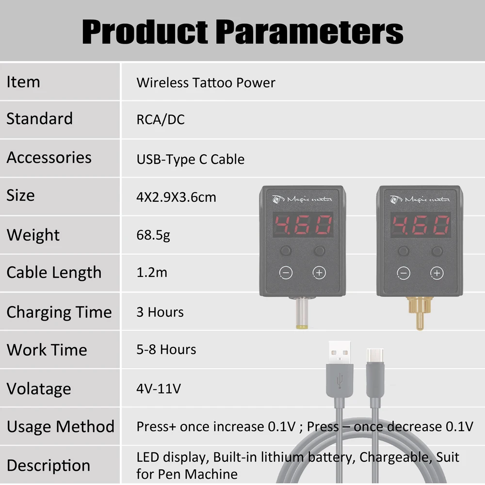 Для тату-пистолета: Материал: алюминиевый сплав скорость: Макс. 10000 об/мин вход: Макс. 12В ход: 3,5 мм Двигатель: 4,5 Вт Порошковая игла moter: картриджи иглы Цвет: как показано на рисунке для питания: 1. Название продукта: беспроводной источник питания татуировки 2. Материал: пластик 3. Выходной ток: 1А 4. Подключение: RCA/DC 5. Емкость аккумулятора: 1800 мАч 6. Размер: 5,6*4,7*3,6 см 7. Вес: 55 г 8. Тип зарядки: type-C (кабель Type-C входит в комплект)