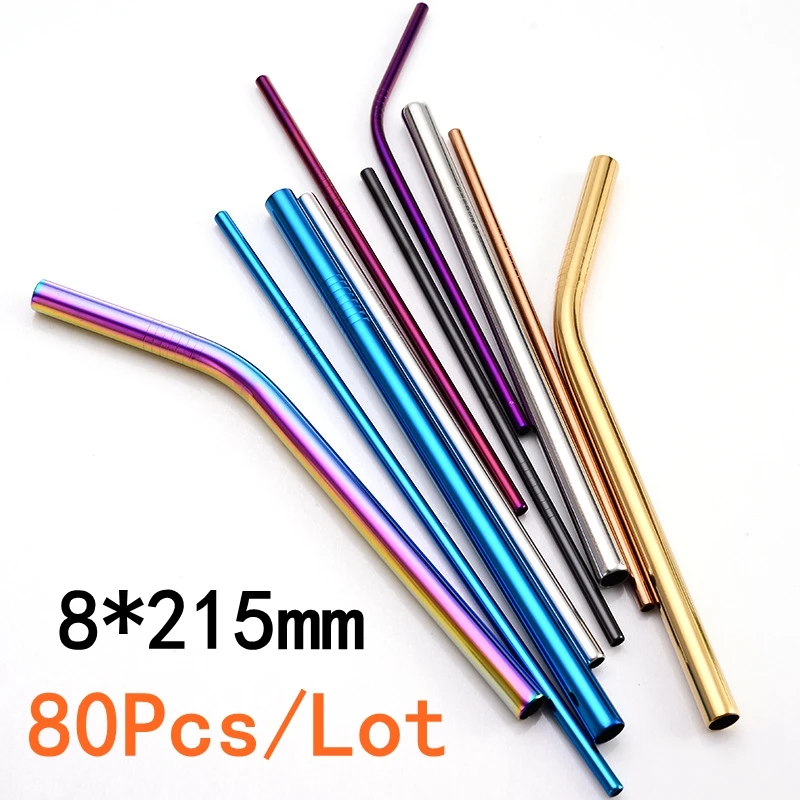 80 шт 8 мм * 215 мм многоразовая металлическая солома 304 нержавеющая сталь Питьевая прямая изогнутая соломинка Экологичные аксессуары для вечеринок