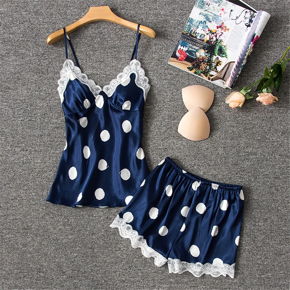 Женская атласная пижама, сексуальное нижнее белье, пижама на бретельках, синяя, красная, белая, шелковая пижама, Милая женская пижама из 3 частей с нагрудными подушечками, Повседневная Пижама