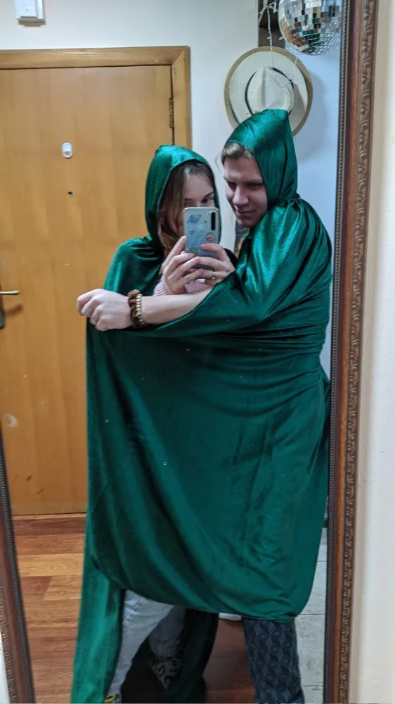 Мантия для маленького размера, мне на 52 она не сходится, смотрится как накидка на спину. По длинне нормальная, по качеству материала тоже замечательно.