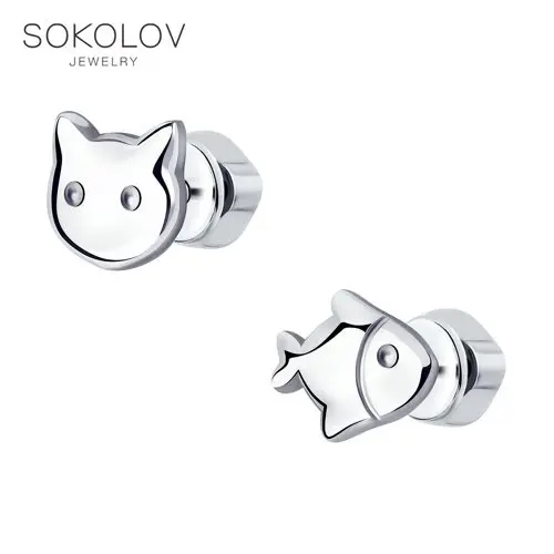 Серьги SOKOLOV из серебраСтильные серебряные пусеты в виде котика и рыбки с гладкой фактурой понравятся не только девочкам и подросткам, но и модницам до тридцати лет. Минимализм и будто нарисованная в металле простота вдохновляет на создание самых беззаботных образов, причём как летних, так и зимних. Универсальный дизайн и невероятно милый стиль легко впишутся в повседневный casual.