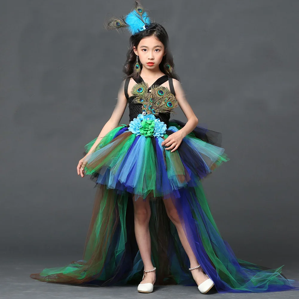 Праздничное платье-пачка с павлиньим цветком; Детское праздничное карнавальное вечернее платье; Бальное платье для выпускного вечера; Детское платье на Хэллоуин с перьями павлина