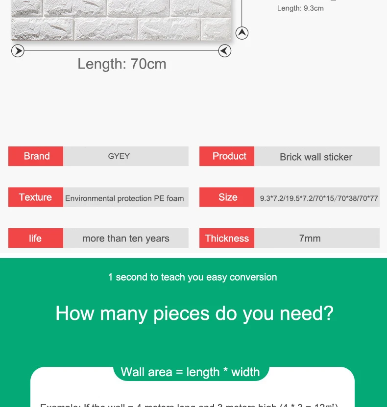 Особенность:1: трехмерная декоративная мягкая пена, предотвращение столкновений для детей, забота о вашей семье в безопасности.2: Безопасность и защита окружающей среды, не токсичен без запаха, подходит для семейного безопасного домашнего пространства.3: Реалистичный, эффект естественного узора кирпича, простой и современный стиль.4: Бесплатный самоклеящийся дизайн, установка, случайный коллаж, произвольный разрез.5: сравнение обоев улучшает эффект шумоподавления.Способы и инструменты установкиПодготовка: приклейте поверхность чистой с адгезией, такой как: деревянная поверхность, стеклянная поверхность, без пыли стены, ударите по дну стены шпатлевкой и так далее.Паста: задняя крышка рваная бумага, приклеенная К вспомогательным инструментам: ножницы, канцелярский ножВнимание: пожалуйста, покупайте достаточно штук одновременно, чтобы убедиться, что они поставляются из одной партии, чтобы избежать разницы в цвете.