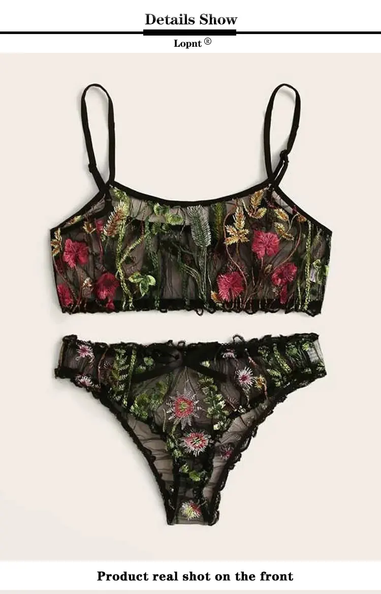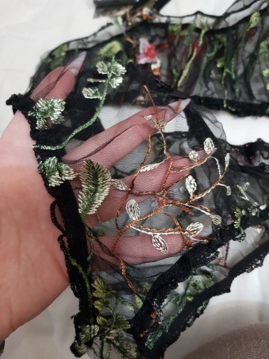 Сеточка, вышивка целы, качество хорошее, особенно за свои деньги. Комплект красиво и нежно смотрится на теле. С размером не прогадала. Покупкой довольна.
