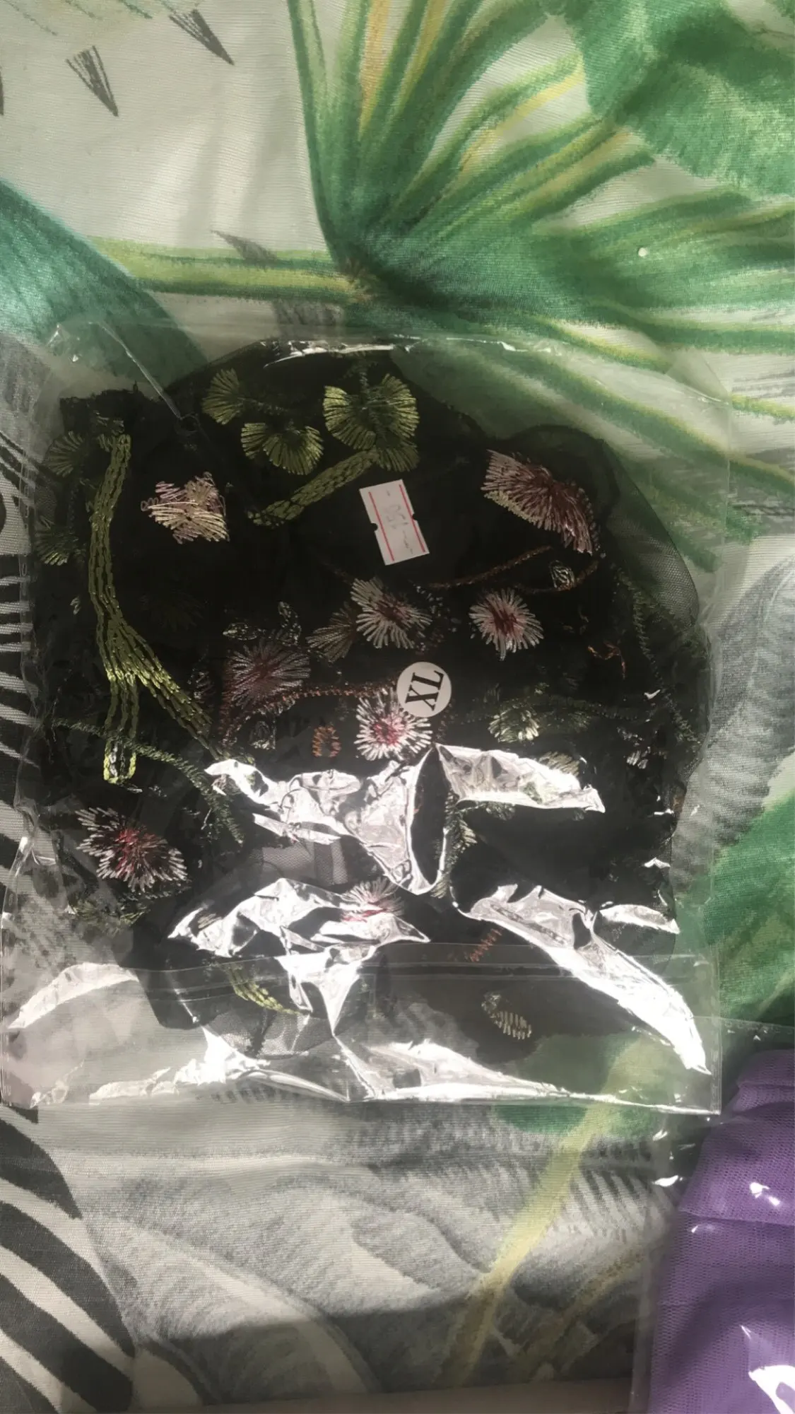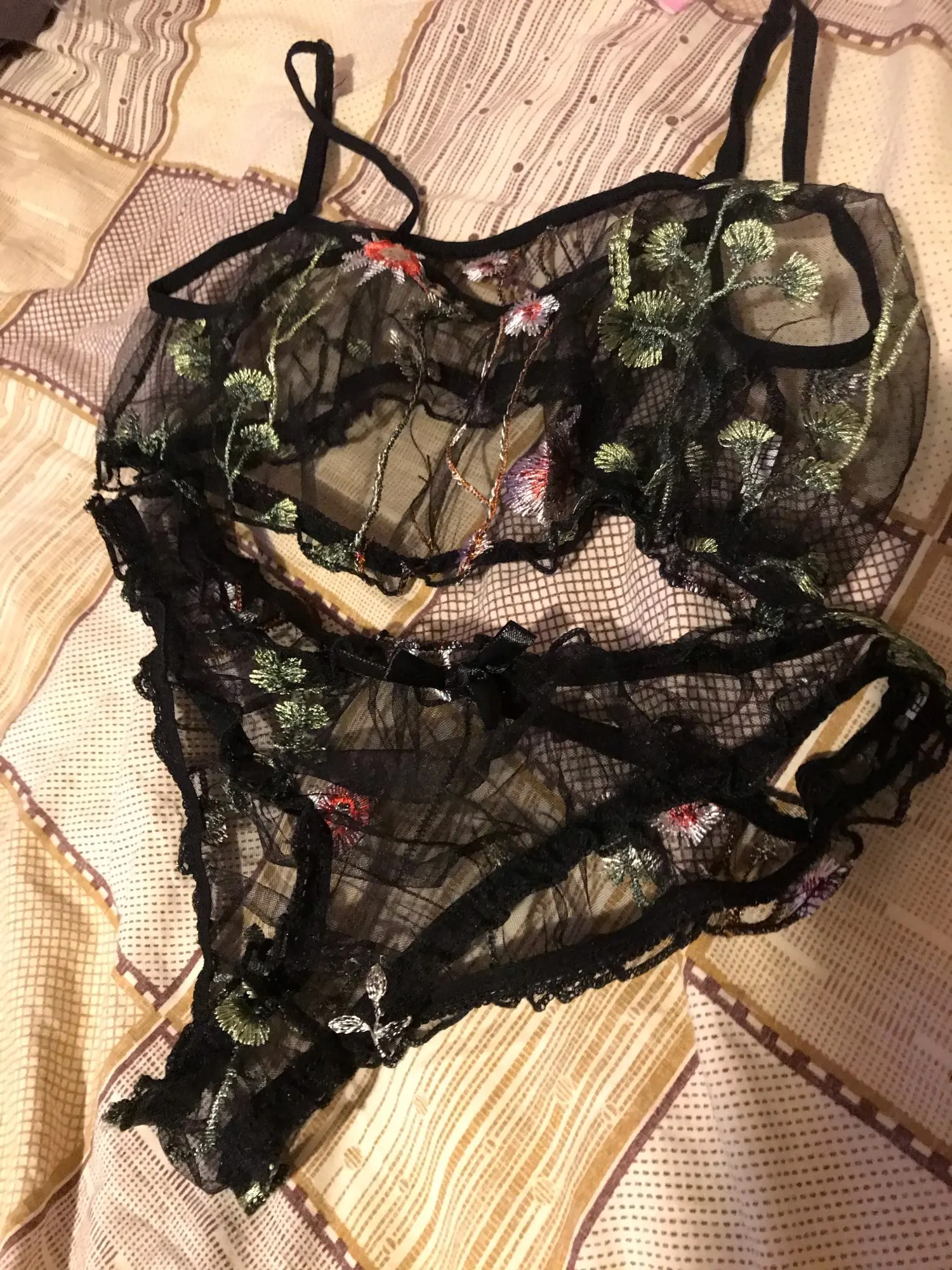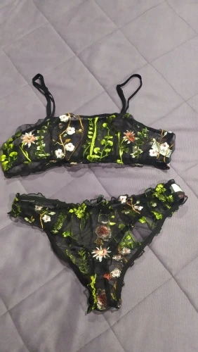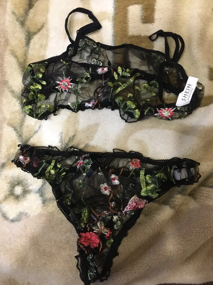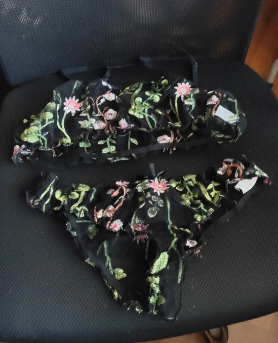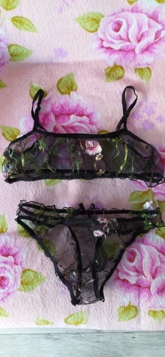 очень красивое белье, немного торчат нитки, на трусах нет ластовицы, сам комплект великоват на 1 размер, за это -1 , доставка за 20 дней, 2 товара объединили в 1 пакет
