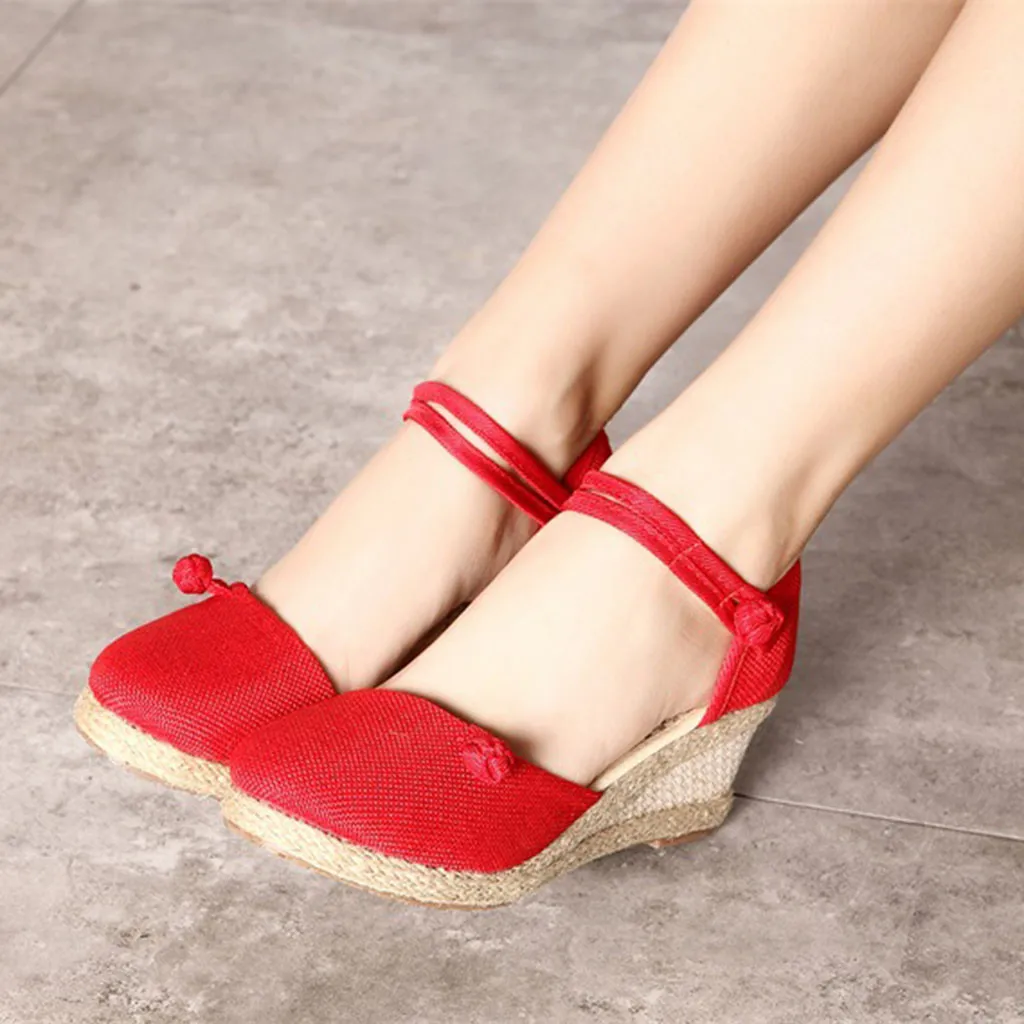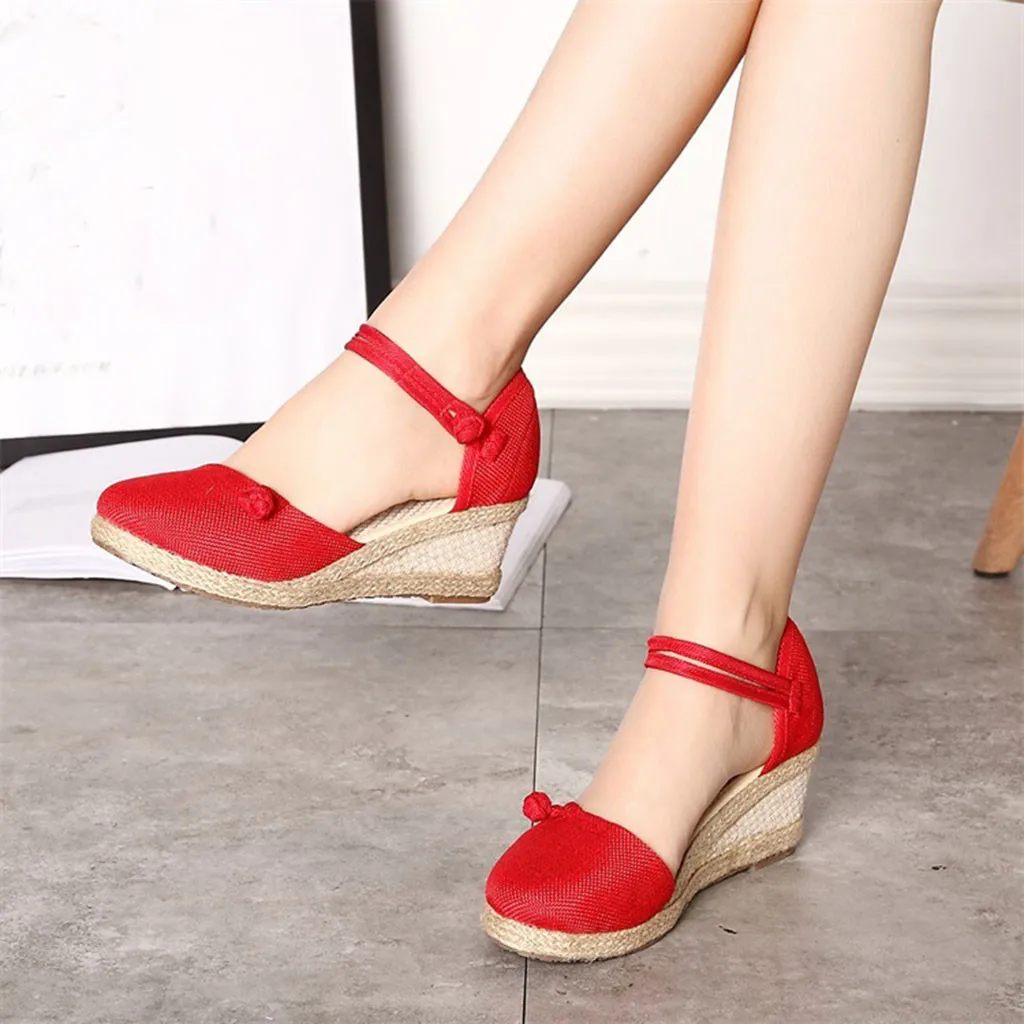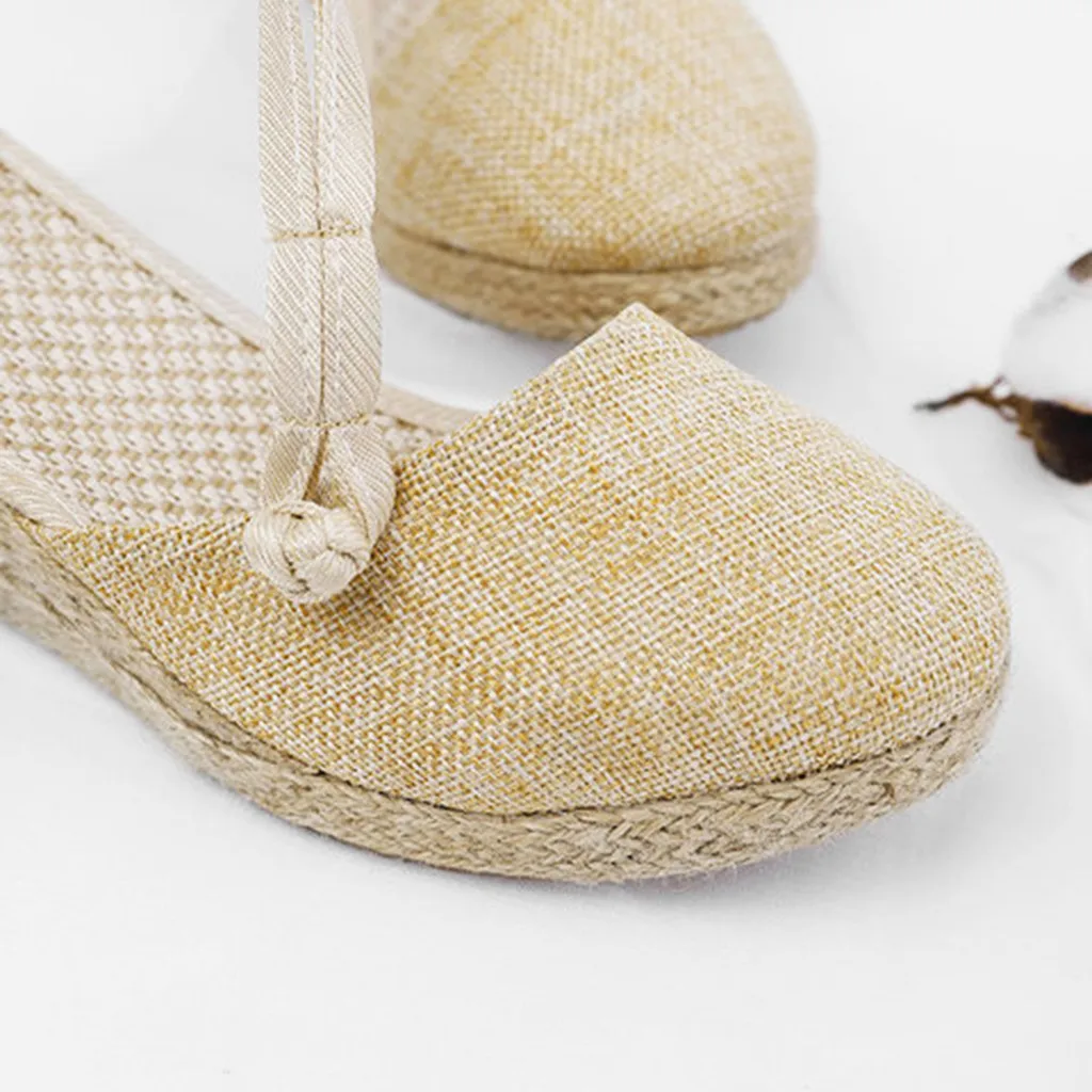 Сандалии женские из текстиля и пеньковой веревки, повседневные босоножки в стиле ретро, на танкетке, с круглым носком, элегантные босоножки с закрытым носком