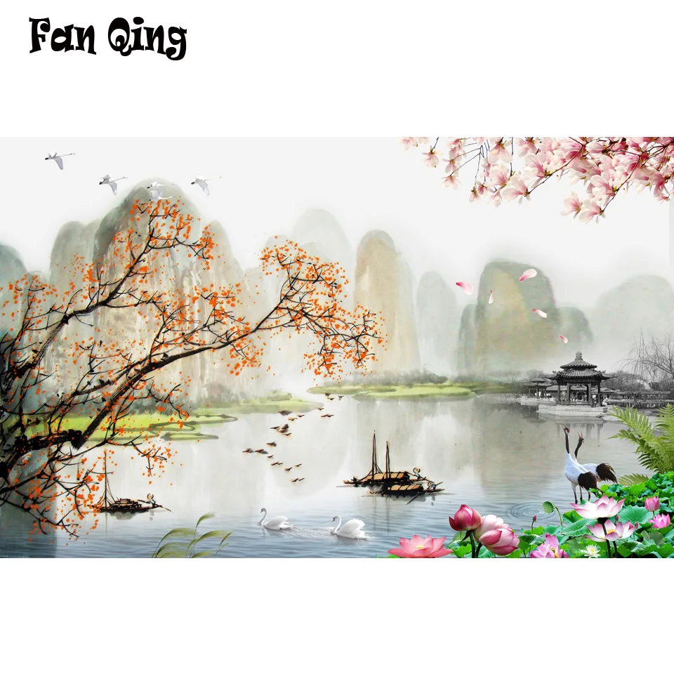 Алмазная живопись 5D "сделай сам", лодка, лотос, журавль, пейзаж, круглаяквадратная вышивка крестом, стразы, мозаика, домашний декор