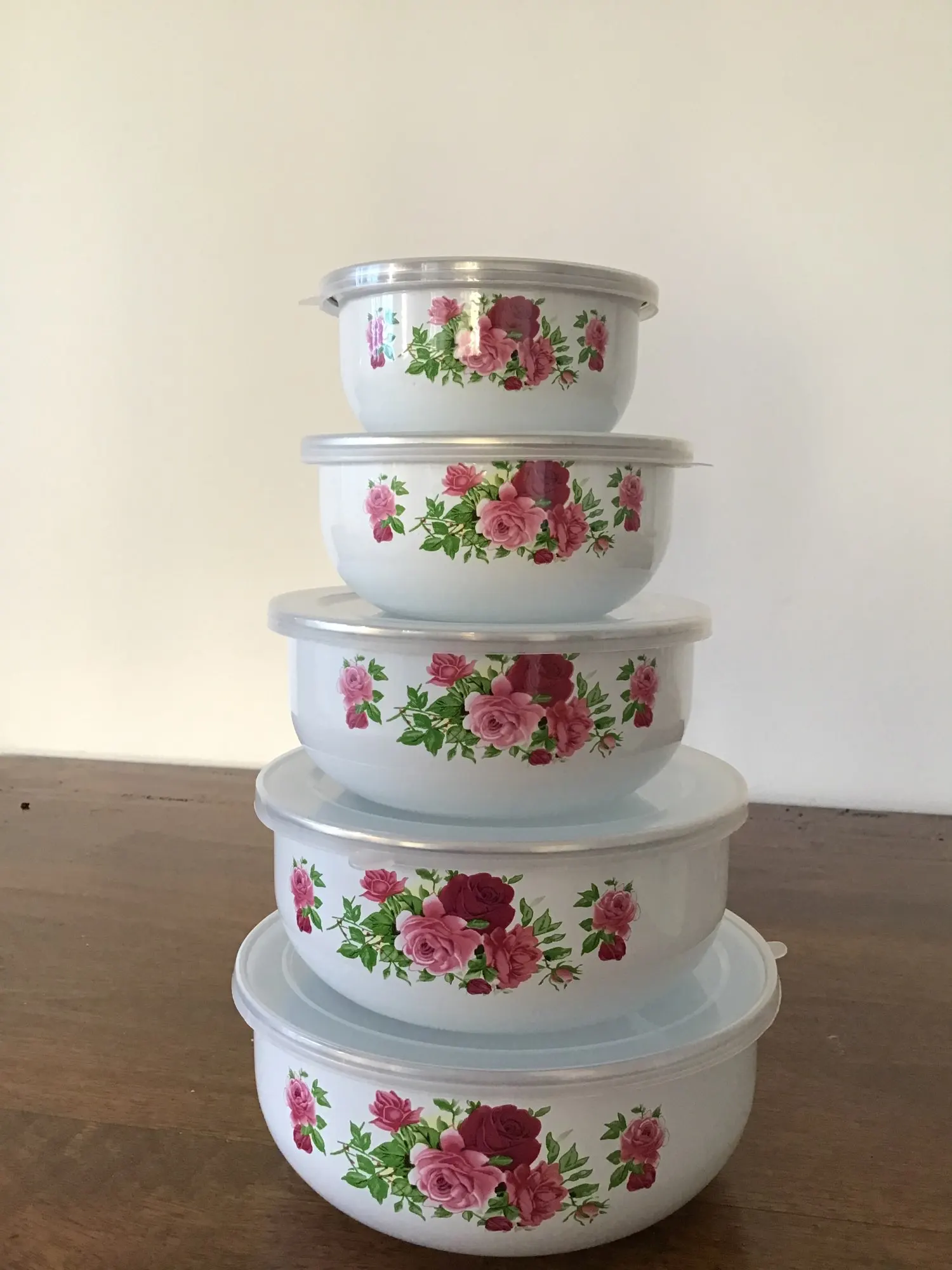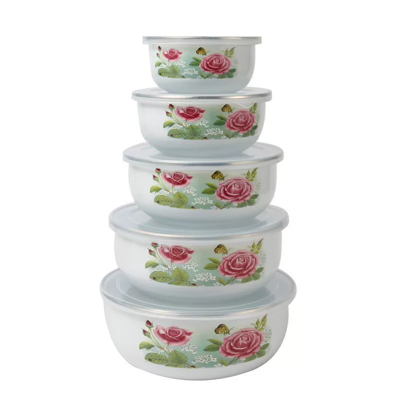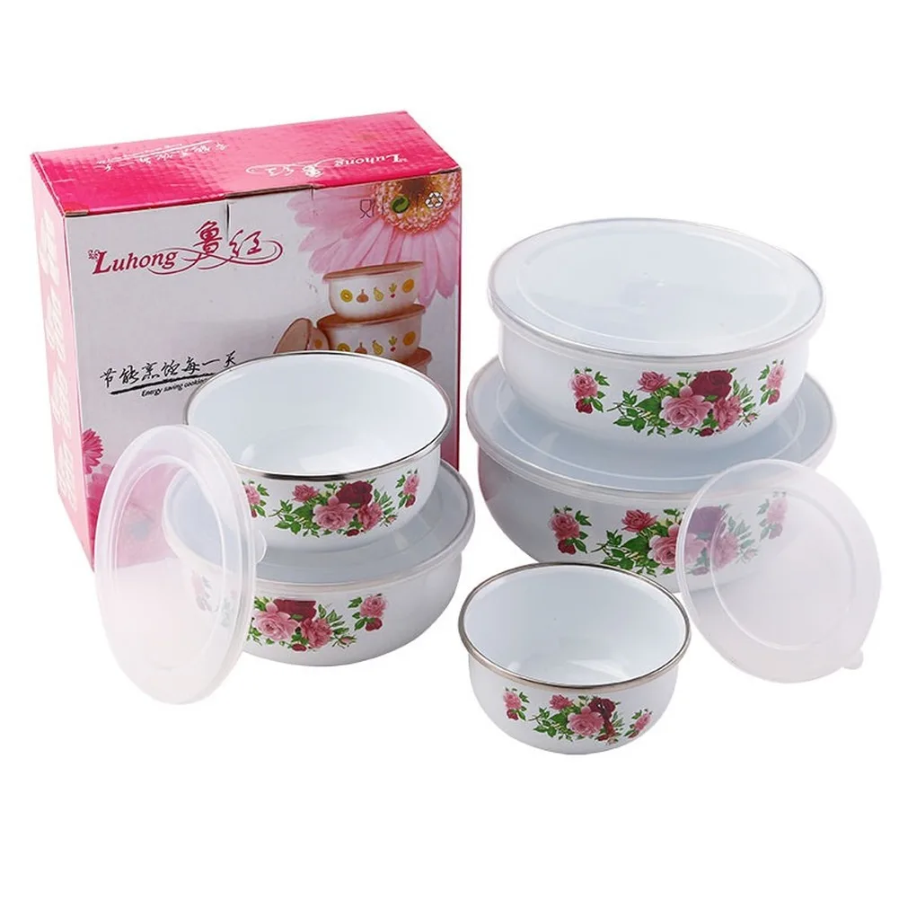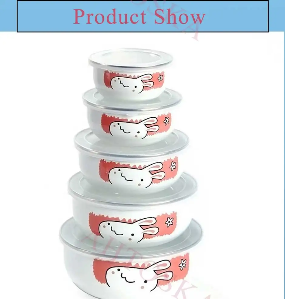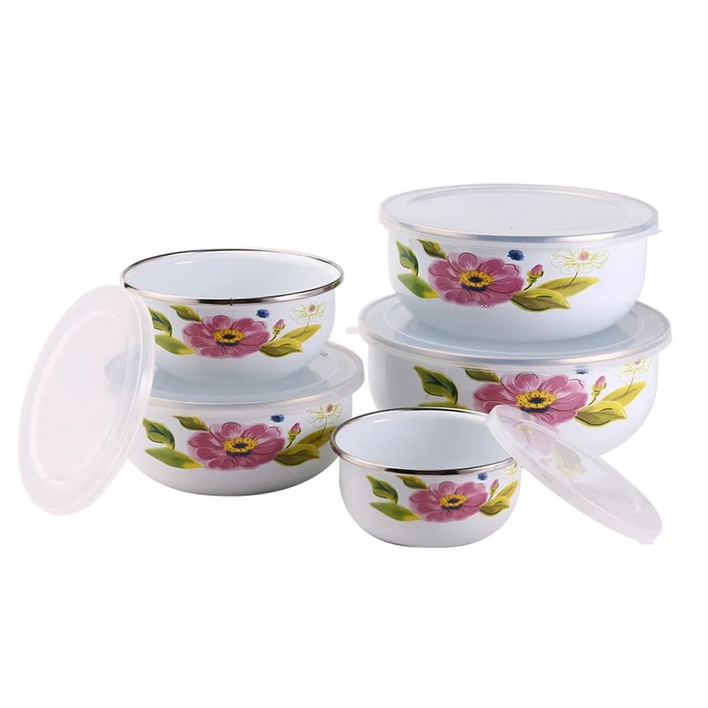 Набор эмалированных мисок 5 шт., креативные чаши с цветами и животными, с эмалью, для салата, еды, с пластиковыми крышками, для домашней кухни