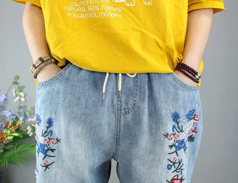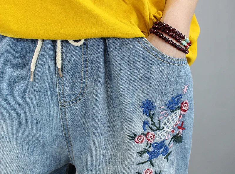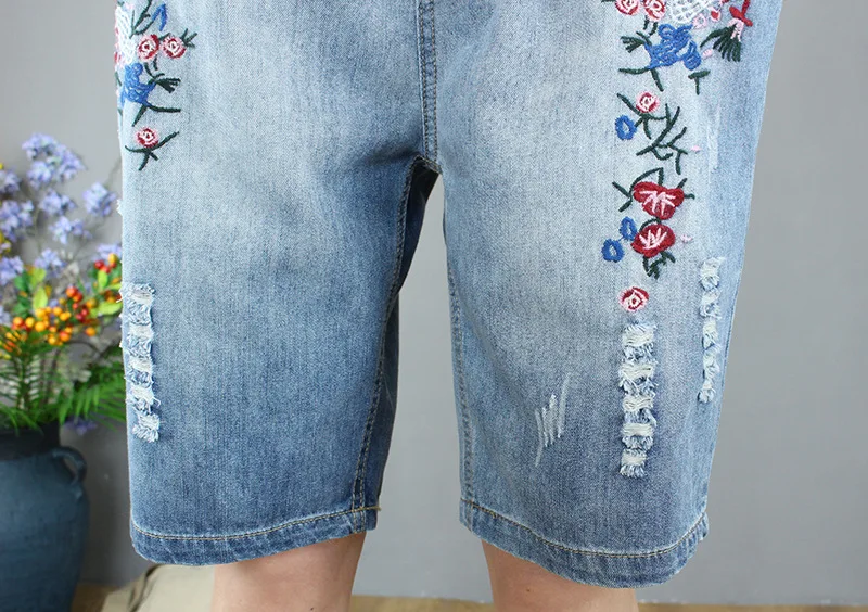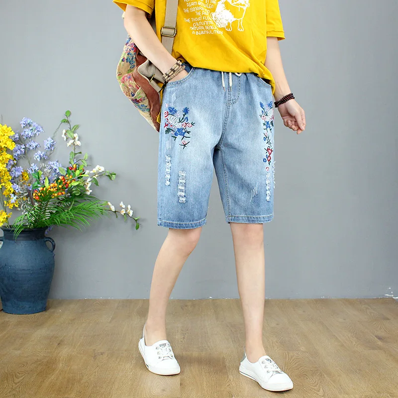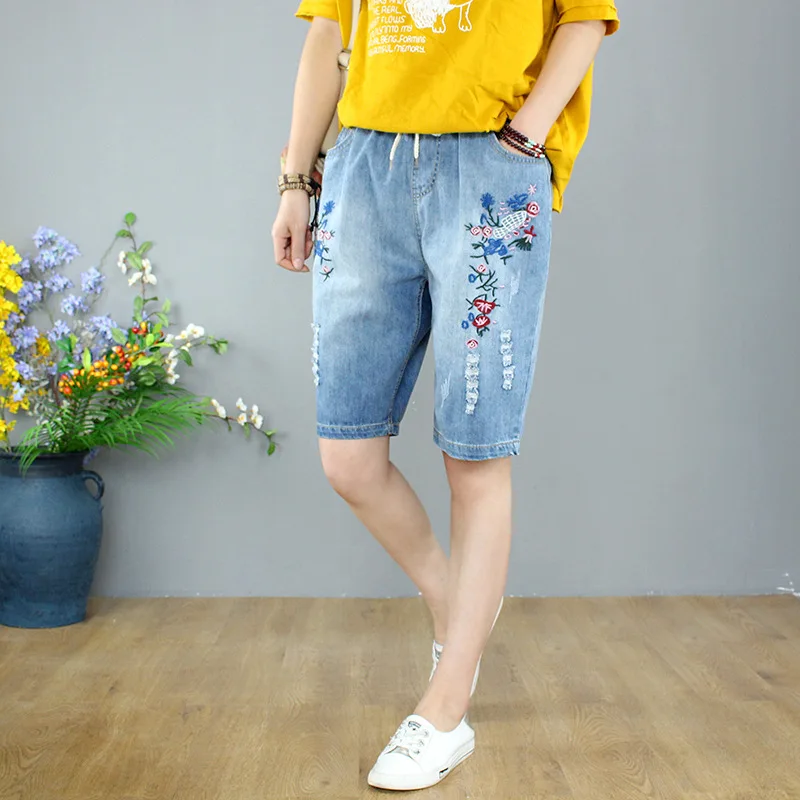 Женские джинсовые шорты с высокой талией, летние свободные шорты с эластичной талией и цветочной вышивкой, 2020