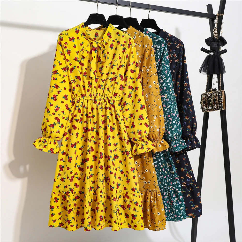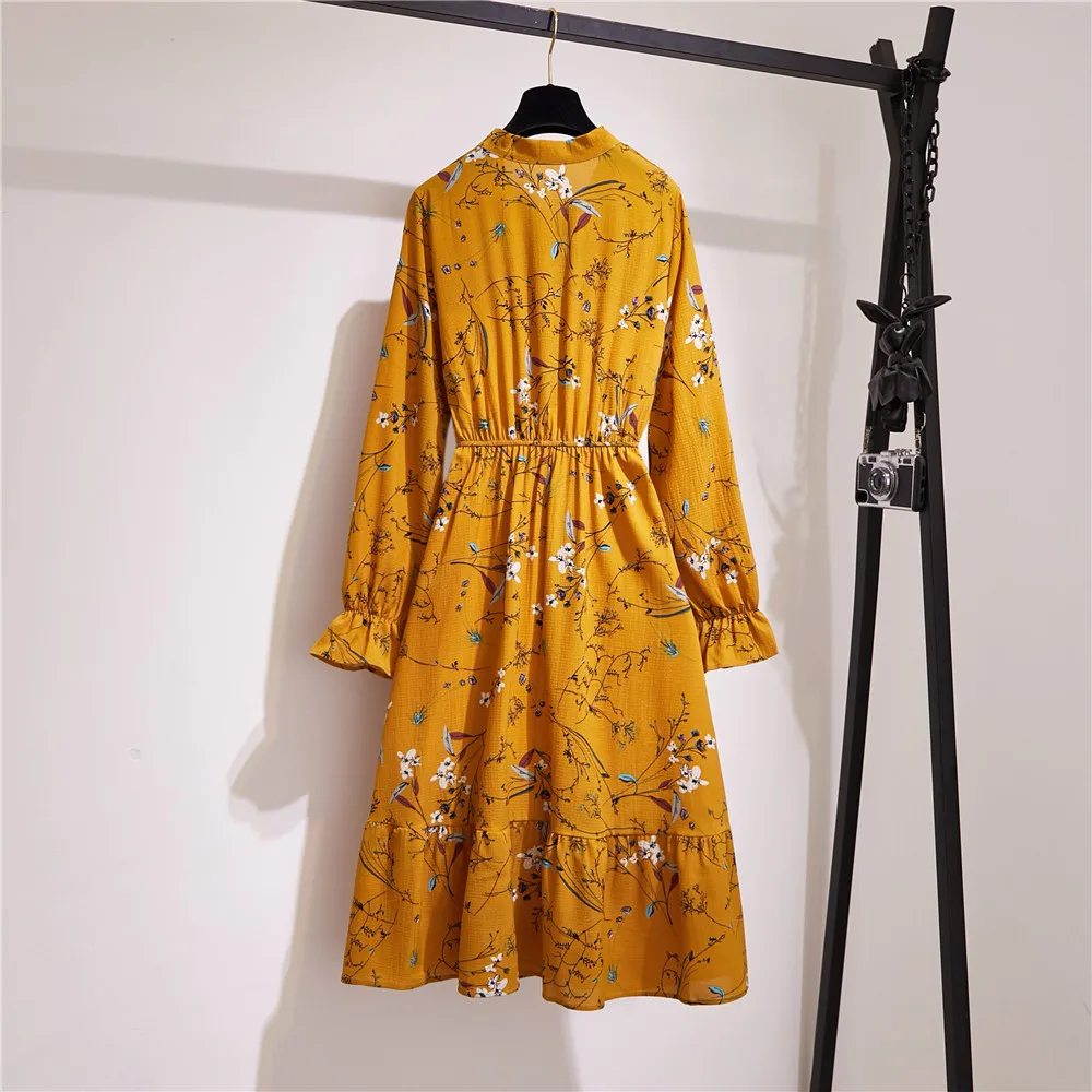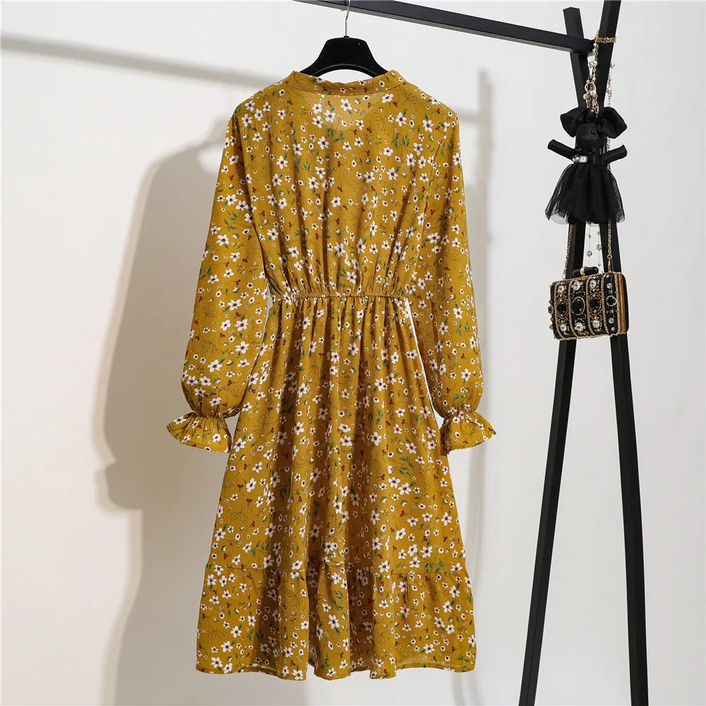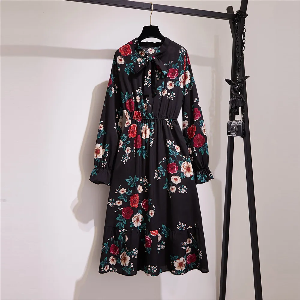 Женское офисное платье миди, Осеннее винтажное платье в горошек с цветочным принтом и длинным рукавом, Корейская рубашка для вечеринок, 2020