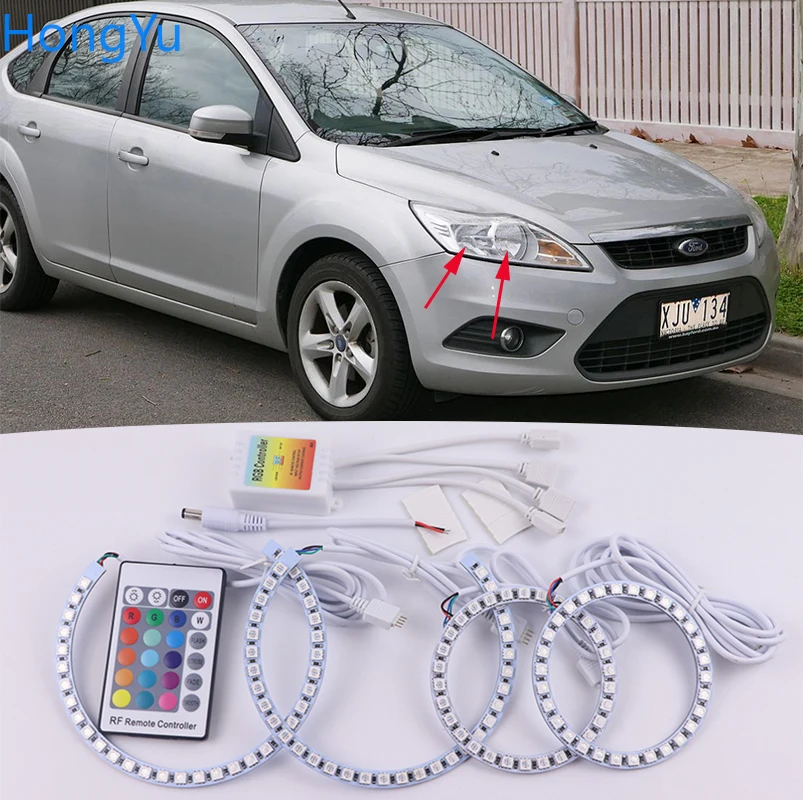 Аксессуары для ford focus MK 2 2004-2011, новейшая фара, разноцветные RGB светодиодные ангельские глазки, кольцевой глаз, ДХО, Радиочастотный пульт дистанционного управления