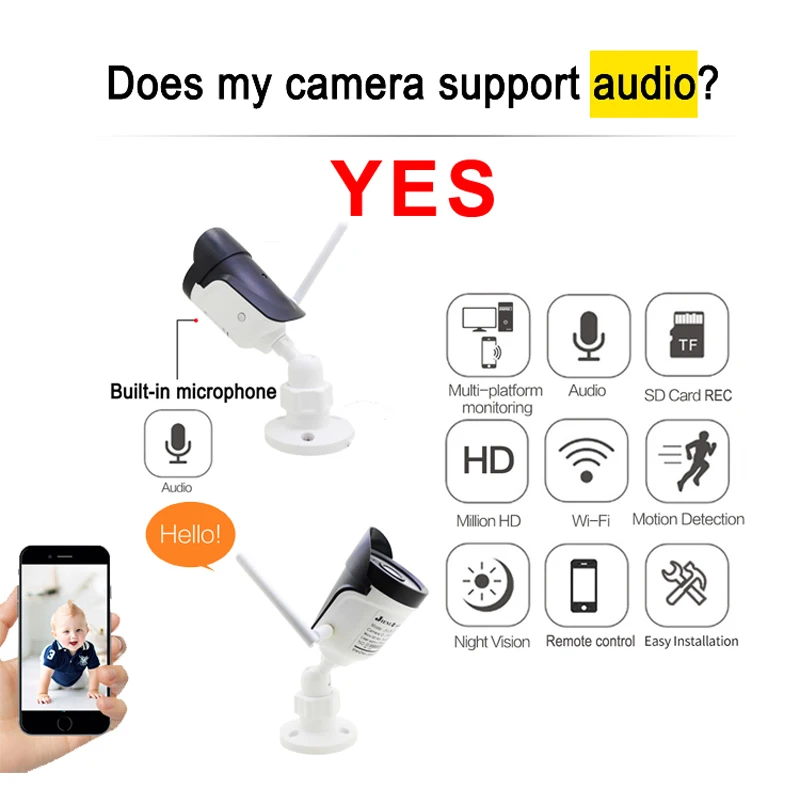 Поддержка беспроводного соединения Поддержка подключения проводного сетевого кабеля Поддержка точки доступа AP Поддержка записи Micro SD Встроенный микрофон Поддержка разрешения HD 720P / 960P / 1080P / 5MP Поддержка компьютера, телефона Android, подключения iPhone