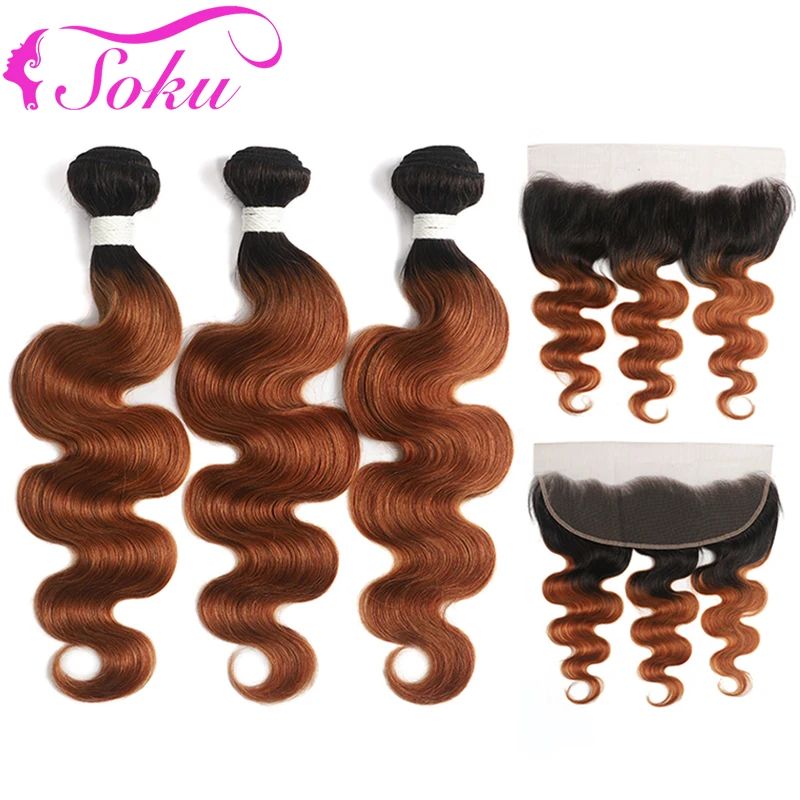 Коричневые пучки волос омбре с фронтальной частью 13x4 SOKU, бразильские волнистые пучки волос с кружевной застежкой, пряди человеческих волос без Реми
