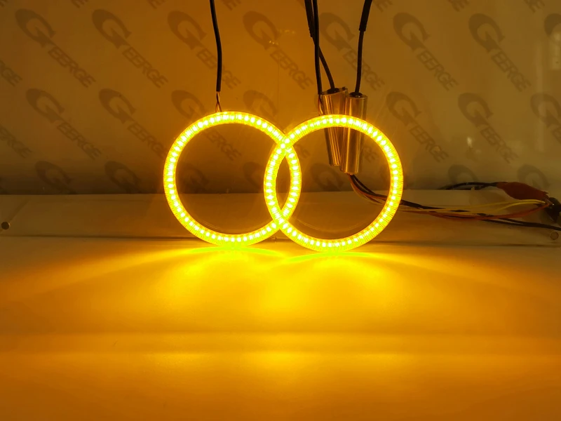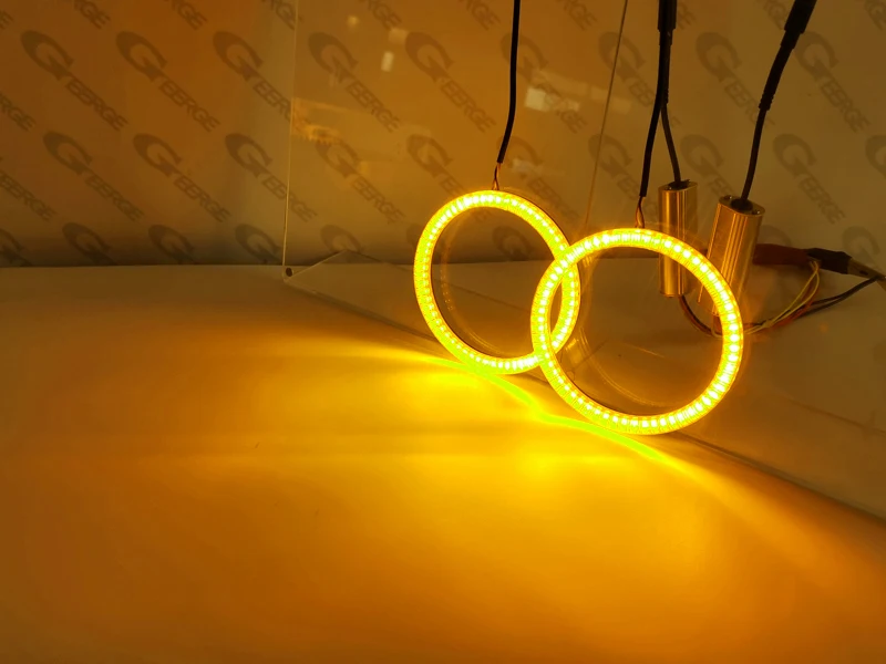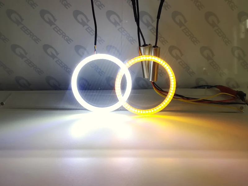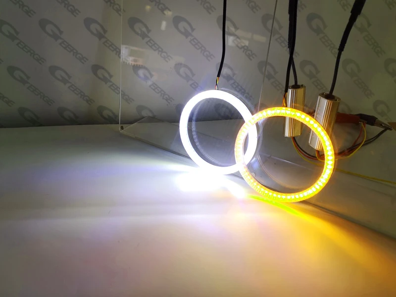Он имеет два цвета: белый и желтый янтарь с функцией задержки переключения. Вы можете использовать янтарную часть в качестве указателей поворота или использовать ее просто как белые или янтарные кольца.