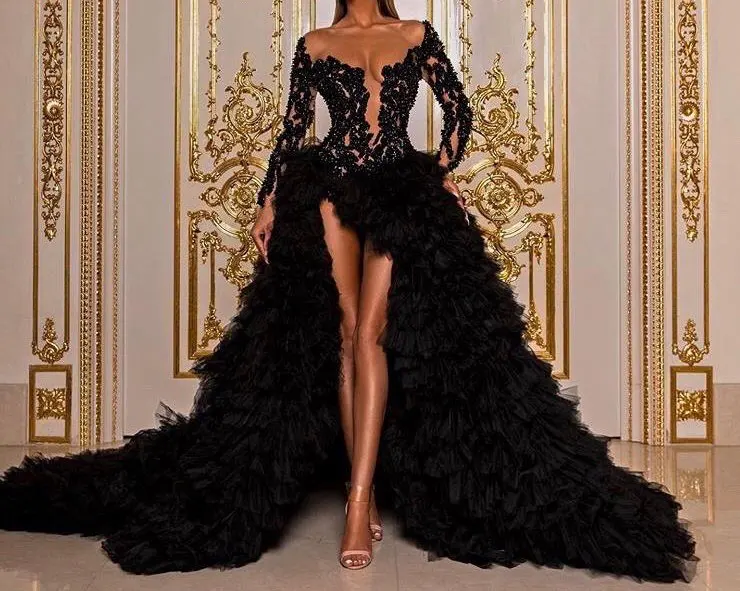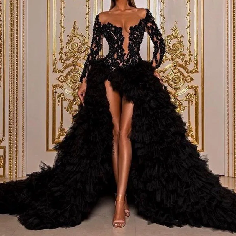 Черное длинное платье-пачка с оборками, кружевное платье с бисером и жемчугом для выпускного вечера, 2019