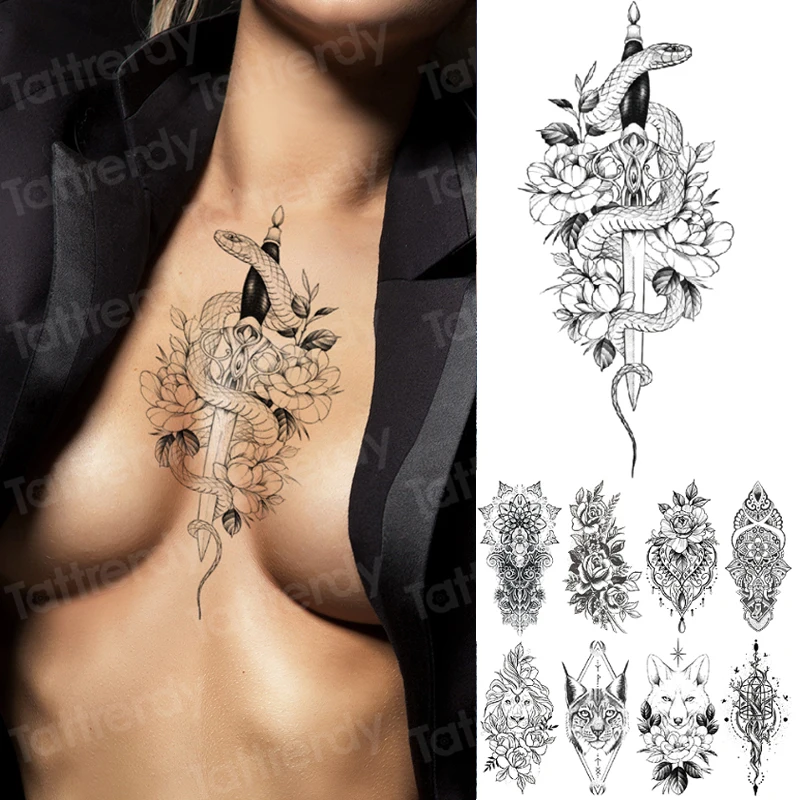 Водостойкая Временная тату-наклейка в виде змеи, цветка розы, блестящая татуировка, кружевная лиса, Лев, краска на теле, искусственная тату на руку для женщин