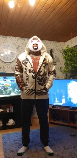 Заказала мужу 6XL, он ростом 193, вес 130, хорошо подошло, сказал, что можно и 5 XL, но это дело вкуса, хотите в облипочку или нет. Не толстая синтетика. Купила с волком и медведем. В толстовке с волком умнее сделано, что капюшон изнутри чёрный, не так быстро в стирку кидать, а с медведем белый.