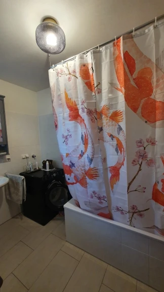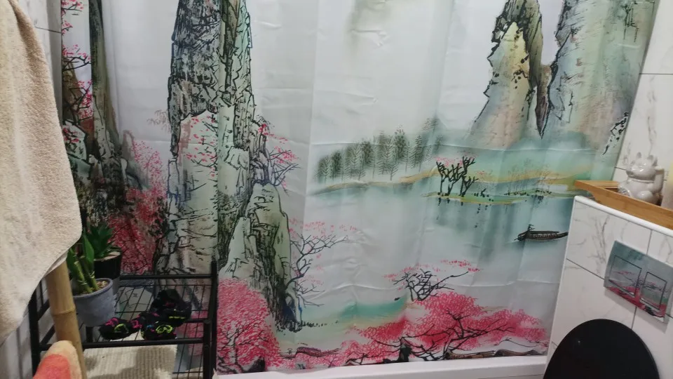 Отличные шторы. Рисунок очень красивый, жаль что вытянули его, почему нельзя было вписать в нужный формат? В комплекте идёт набор колец, чтобы вешать на штангу. При сильном напоре струи вода мелкой пыльцой всё-таки проникает сквозь штору. Но это не критично. Зато отлично радует душу:)
