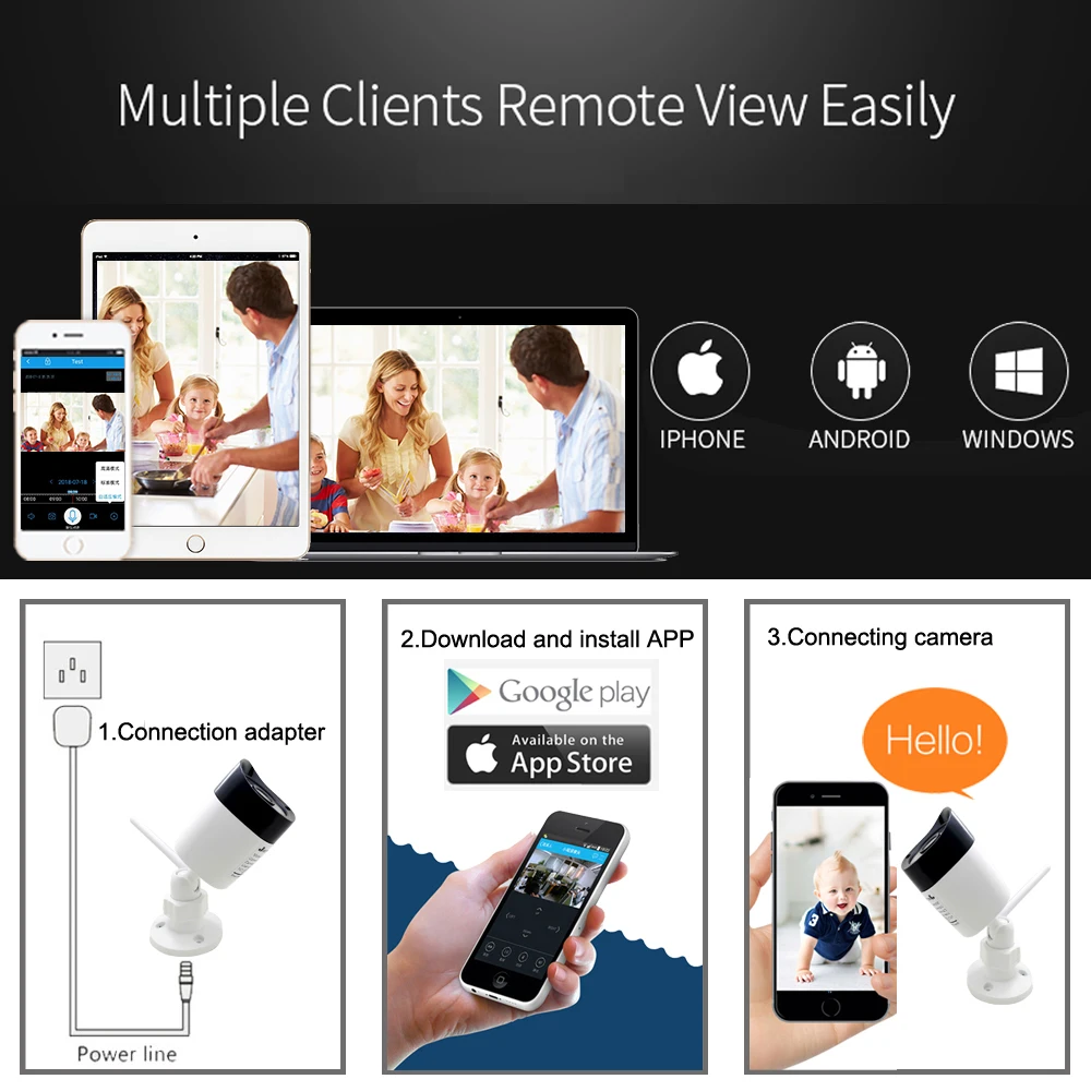 1. Подключите адаптер питания, 2. Установите приложение, 3. Найдите камеру (в комплект входит простая Инструкция по установке, вы также можете посмотреть видео по установке)