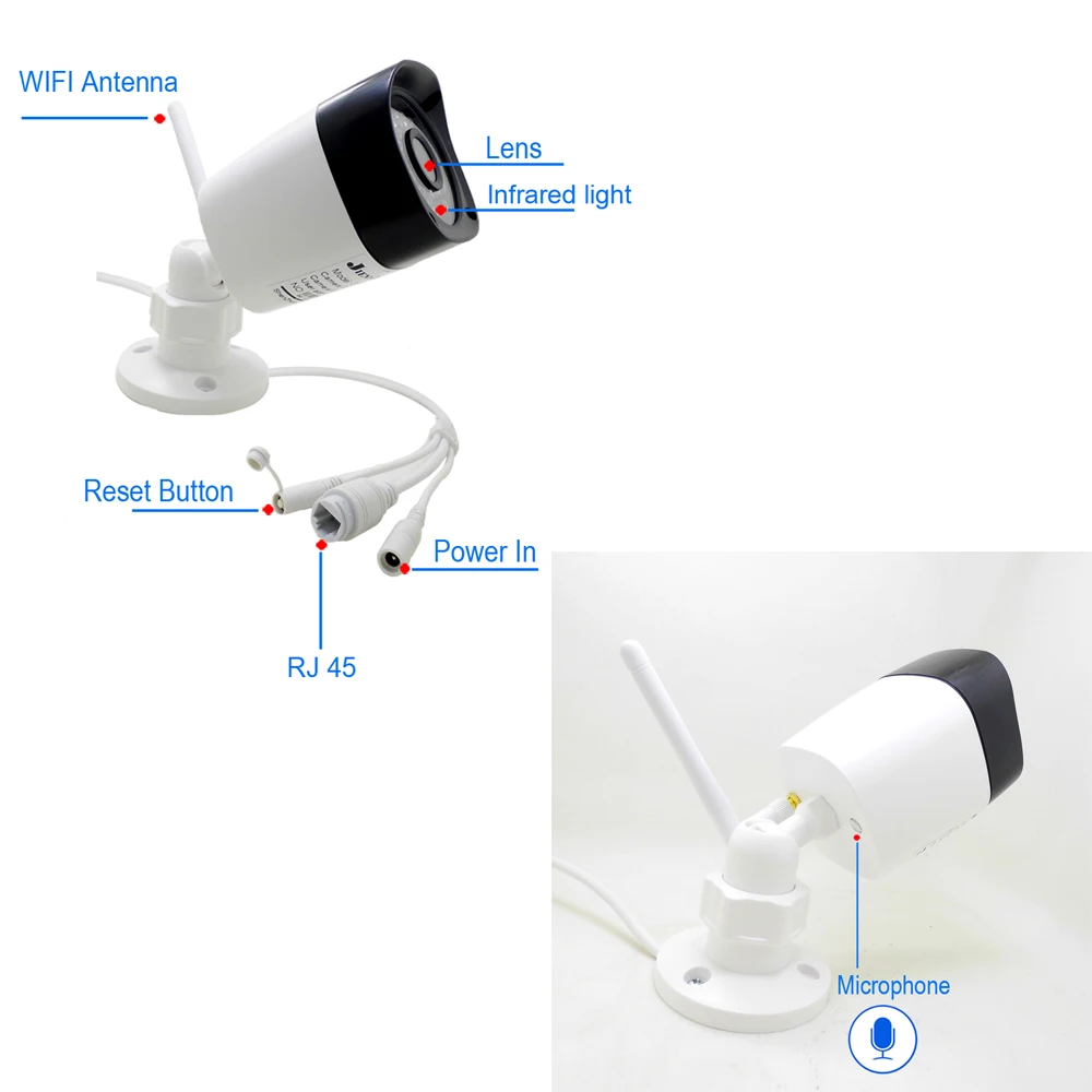Поддержка уличной водонепроницаемости Удаленное видео в реальном времени, звук в реальном времени Аудиозапись Объектив: Дополнительно объектив 3,6 мм (6 мм) Поддерживает как Wi-Fi, так и проводной режим Поддержка карт Micro SD (не содержит карты Micro SD); Поддерживает ONVIF, может работать со вечерние видеорегистратором. Поддержка мобильного видеонаблюдения (iOS,android) Поддержка обнаружения движения и оповещения по электронной почте Встроенный микрофон Поддержка записи видео и звука