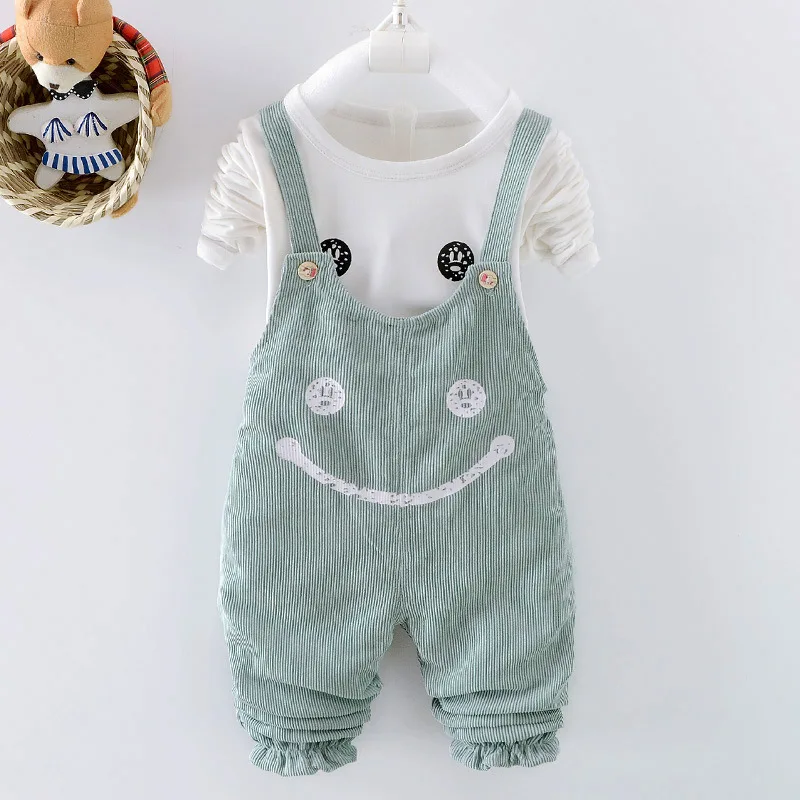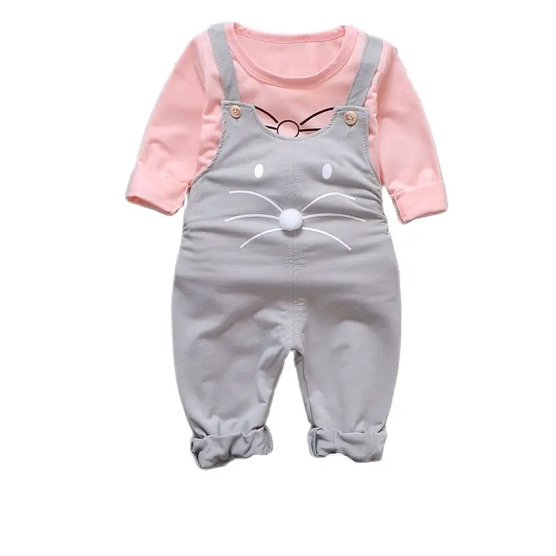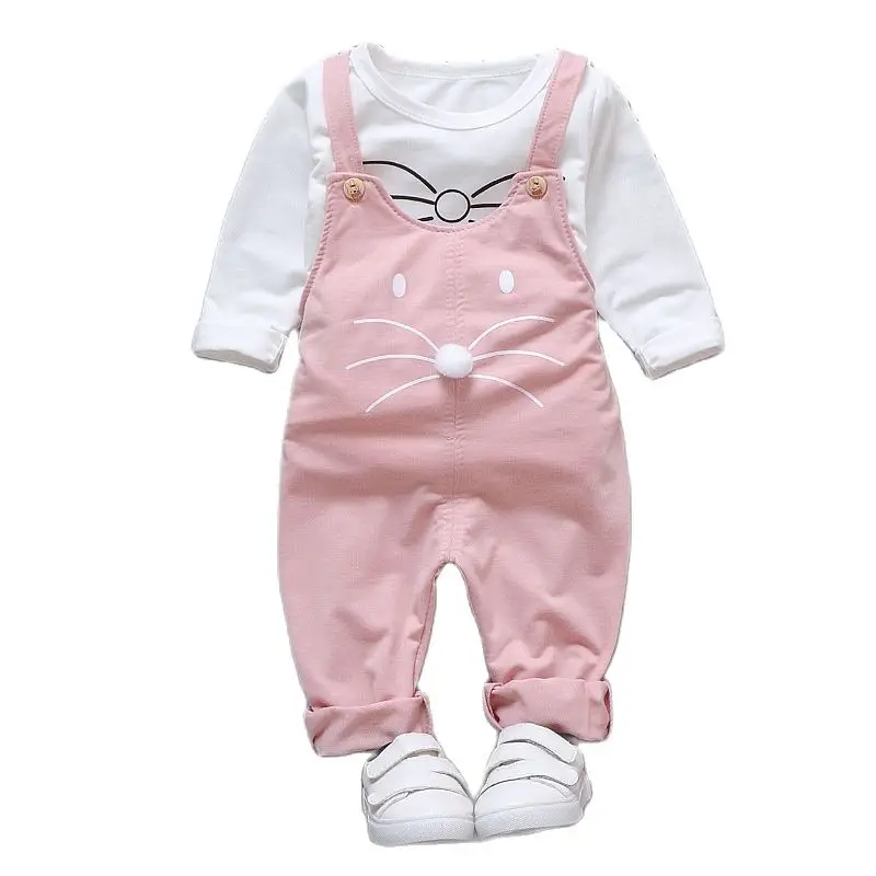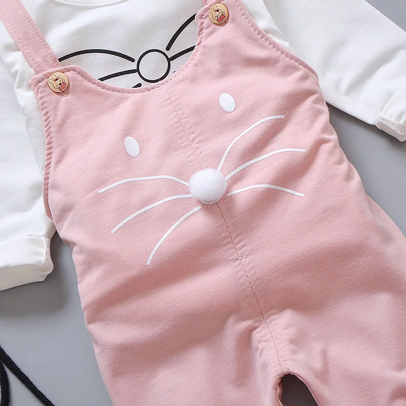 Хлопковые комплекты одежды с мультяшным котом для маленьких девочек, футболка с длинным рукавом + комбинезон, костюмы из 2 предметов для младенцев, Осенняя детская верхняя одежда, одежда для маленьких девочек