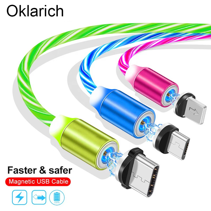 Магнитный зарядный кабель течет с подсветкой Магнит Micro USB кабель для быстрой зарядки с разъемом USB Type-C для iPhone Samsung Android мобильный телефон