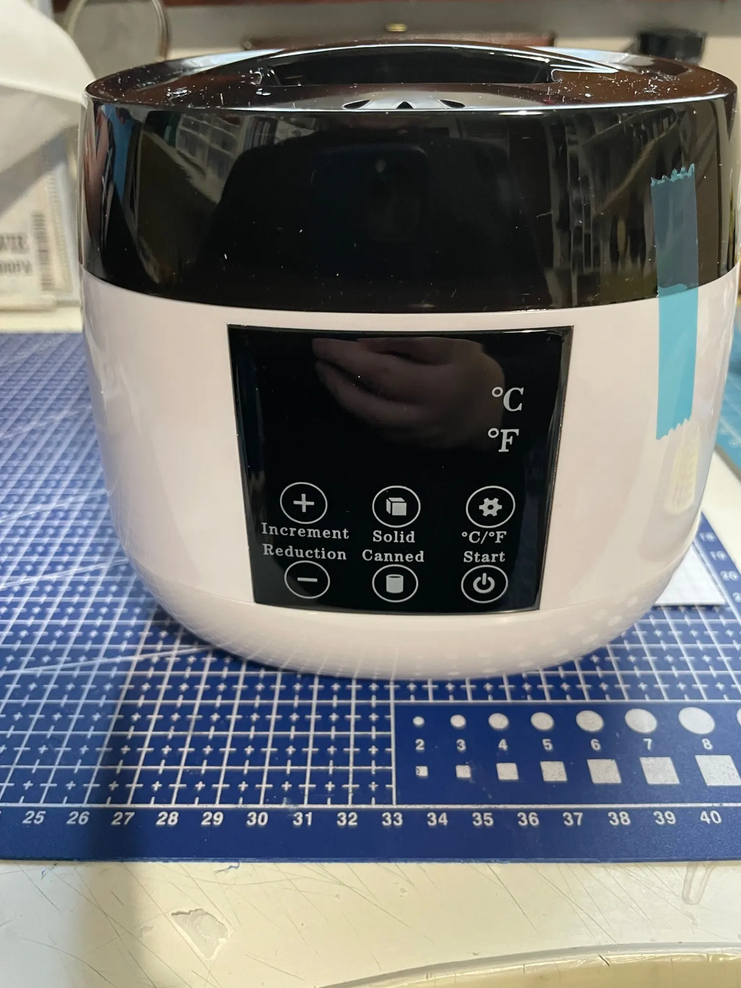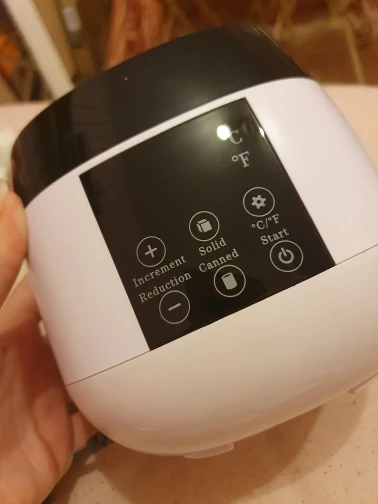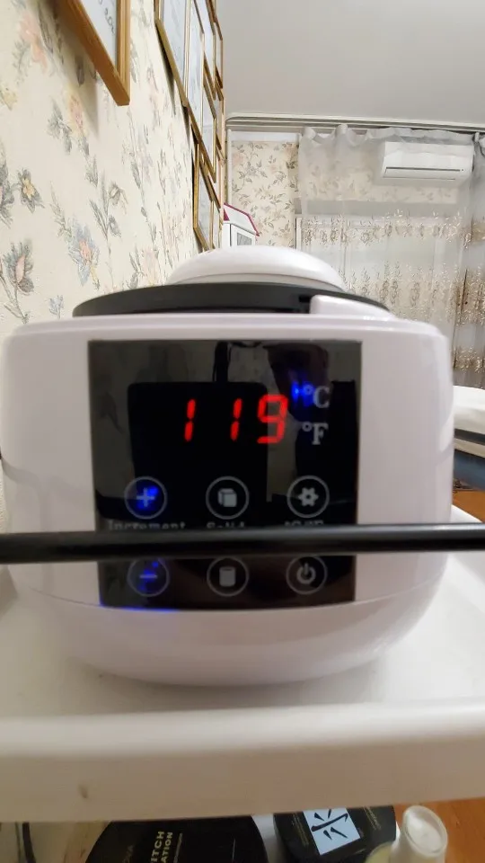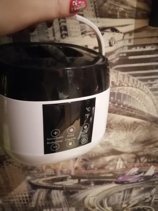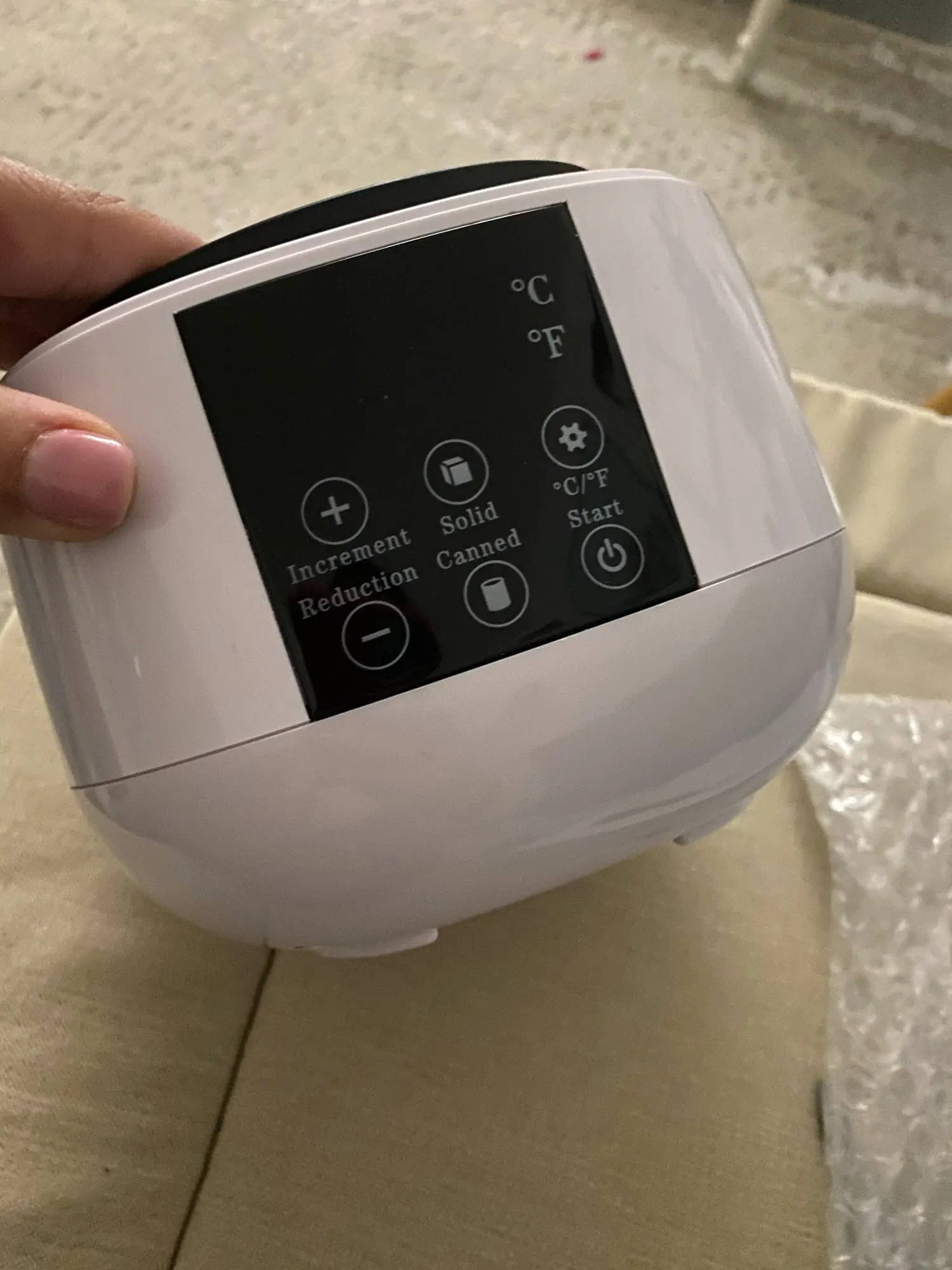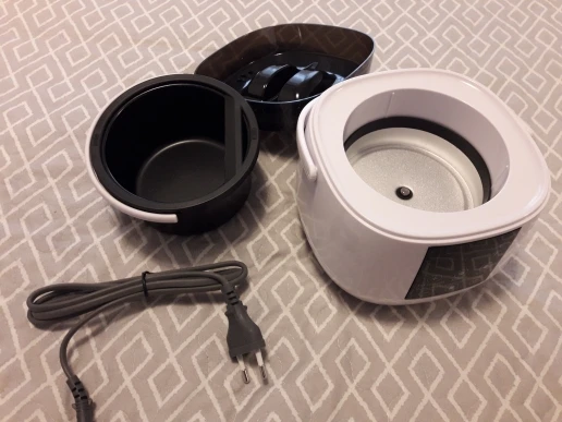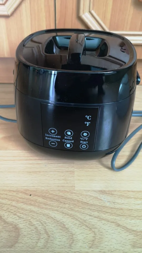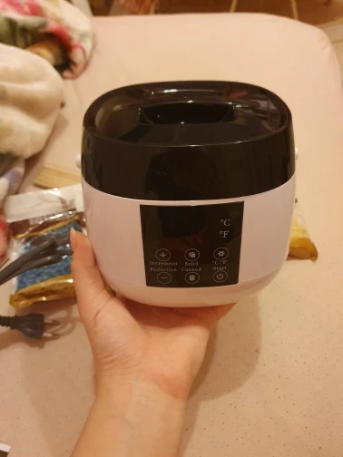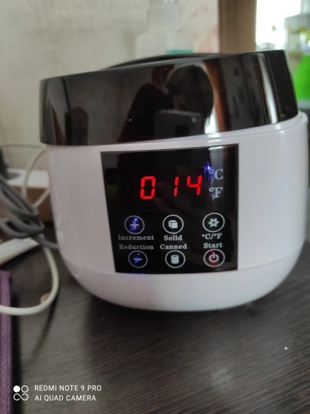 Очень отличный Мини-нагреватель воска. После включения вы можете установить степень, которую вы хотите, максимум до 120 • C, регулируемый 1 в 1, Тип градусов чтения, а также он имеет предварительный набор, на вид воска, который должен раствориться (твердый воск или консервированный воск). Если вы поворачиваете внутреннюю часть, пока духовка достигает температуры, это сигнал (1bip). Сверху она имеет удобную ручку бесплатно, единственный дефект, это черная крышка, которая просто наклоняется по всей конструкции. (Заказал 24,11.2020 и прибыл 9,12.2020)